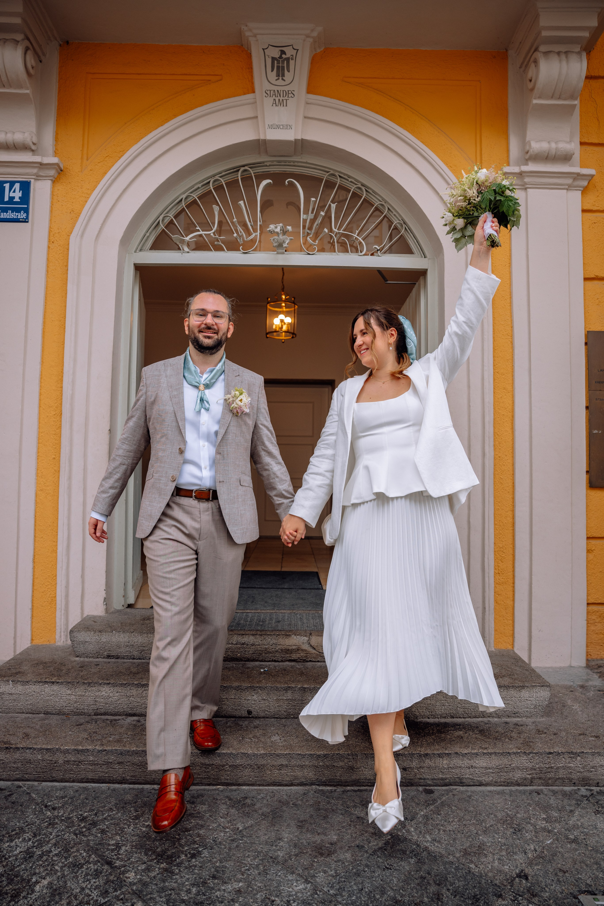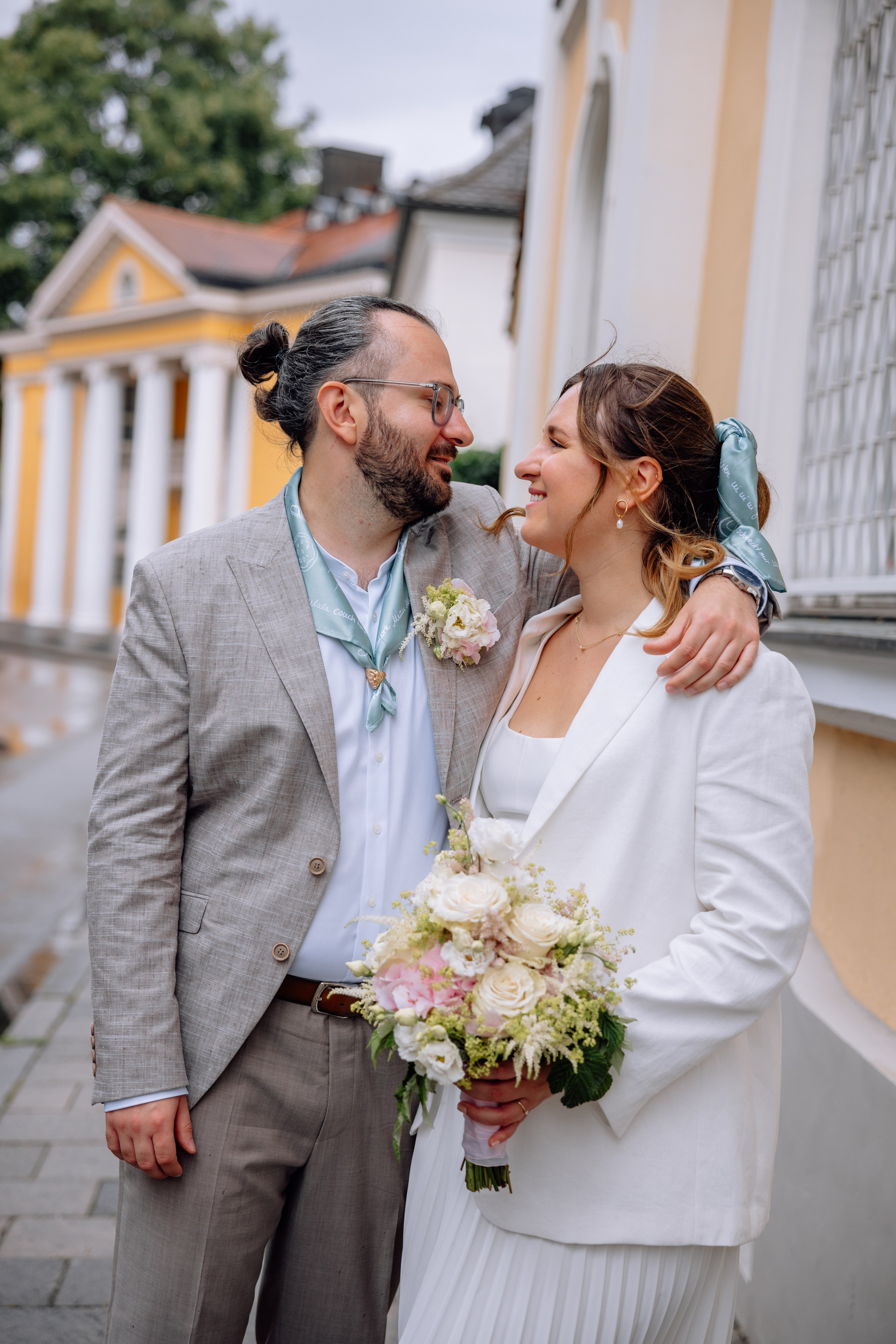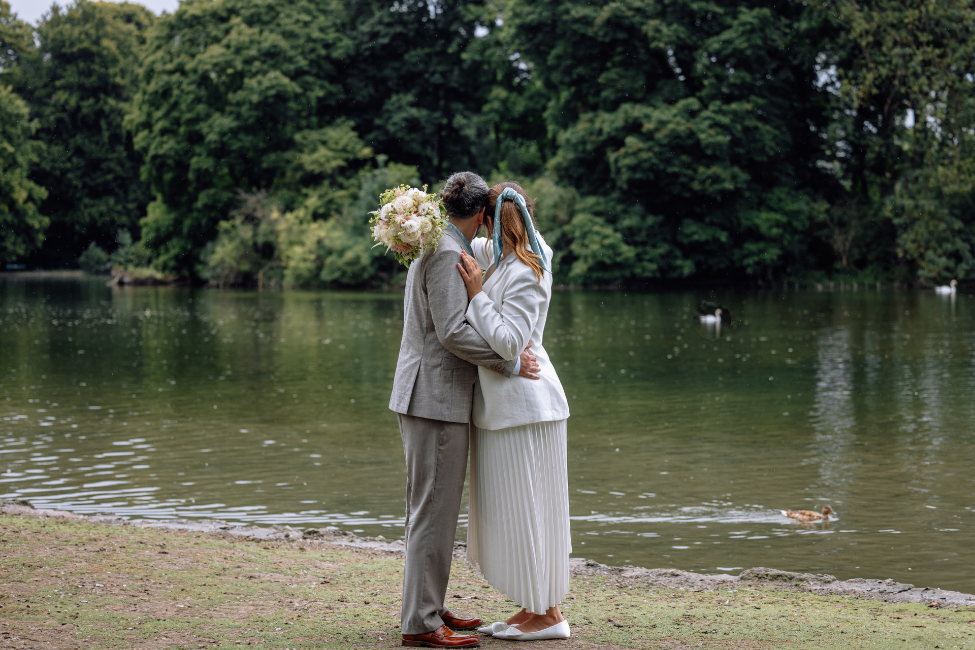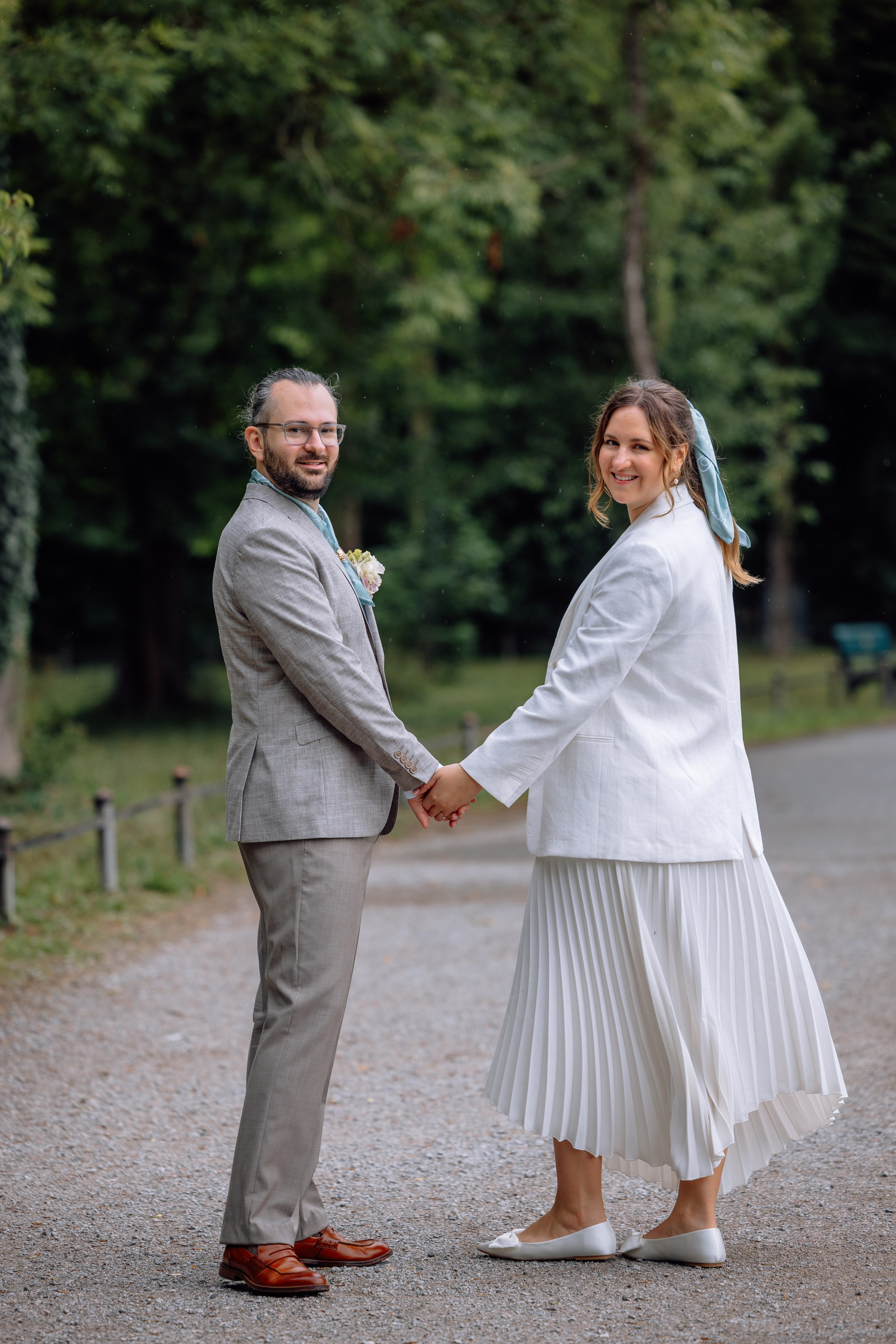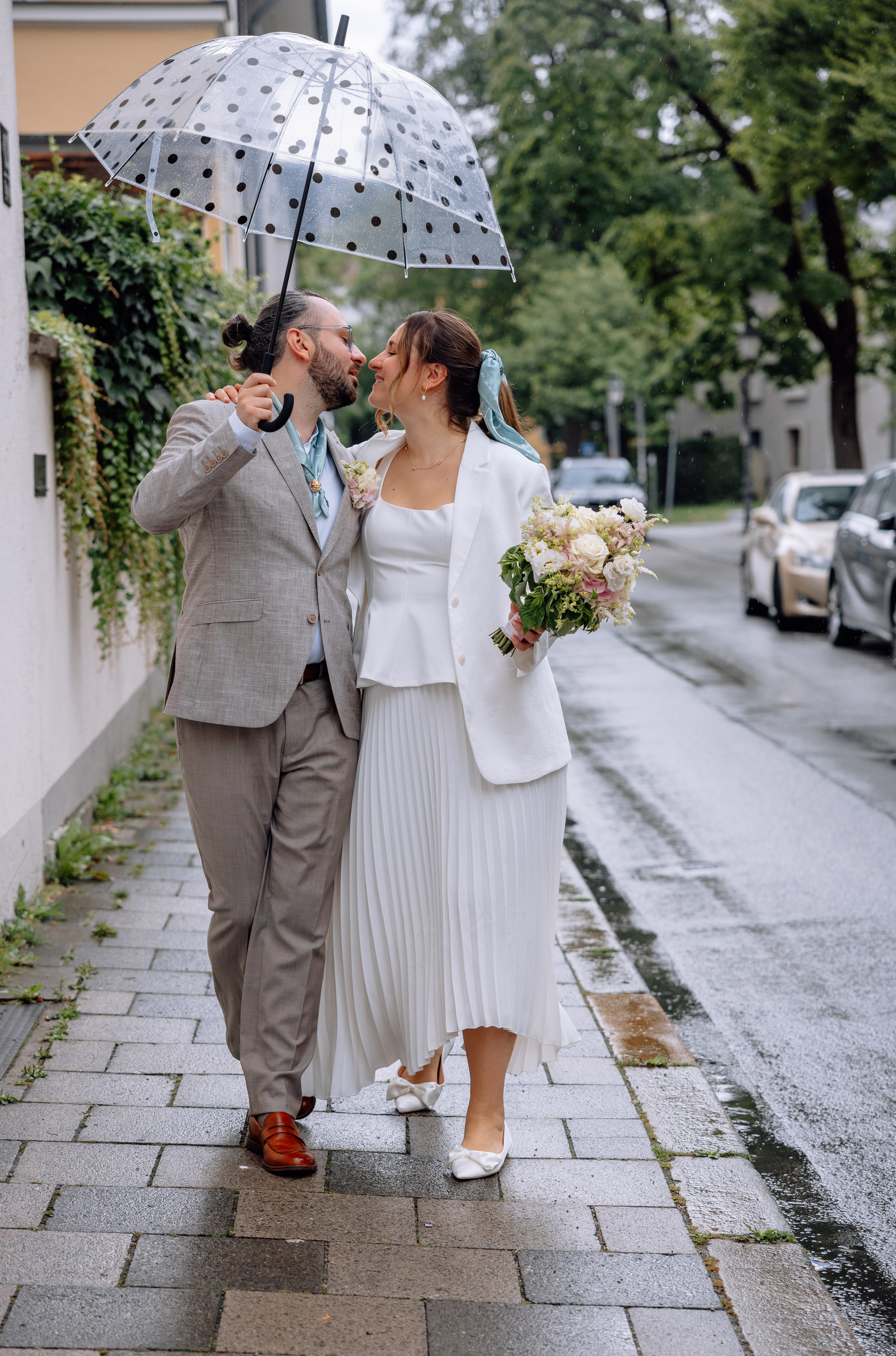 Ein leichter Sommerregen machte diese Trauung im Standesamt Mandlstraße in München noch romantischer. Das junge Brautpaar gab sich in Schwabing das Ja-Wort, bevor wir für Paarfotos in den Englischen Garten gingen. Dort entstanden natürliche Aufnahmen am idyllischen Bachlauf – authentische Hochzeitsbilder, die die besondere Stimmung dieses Tages einfangen.