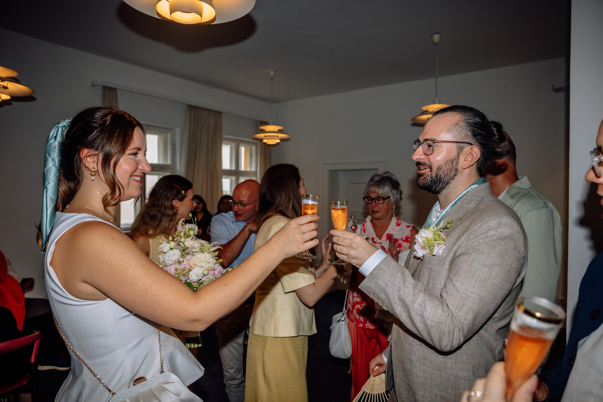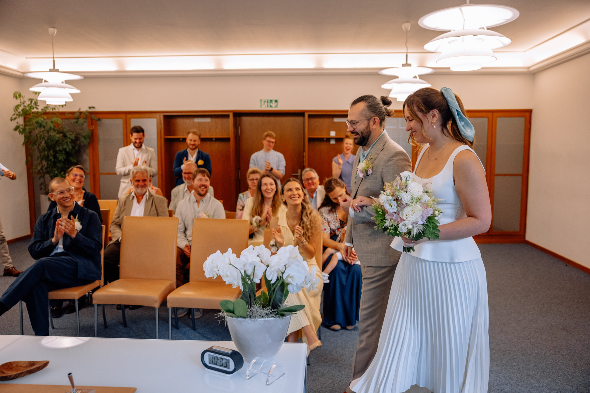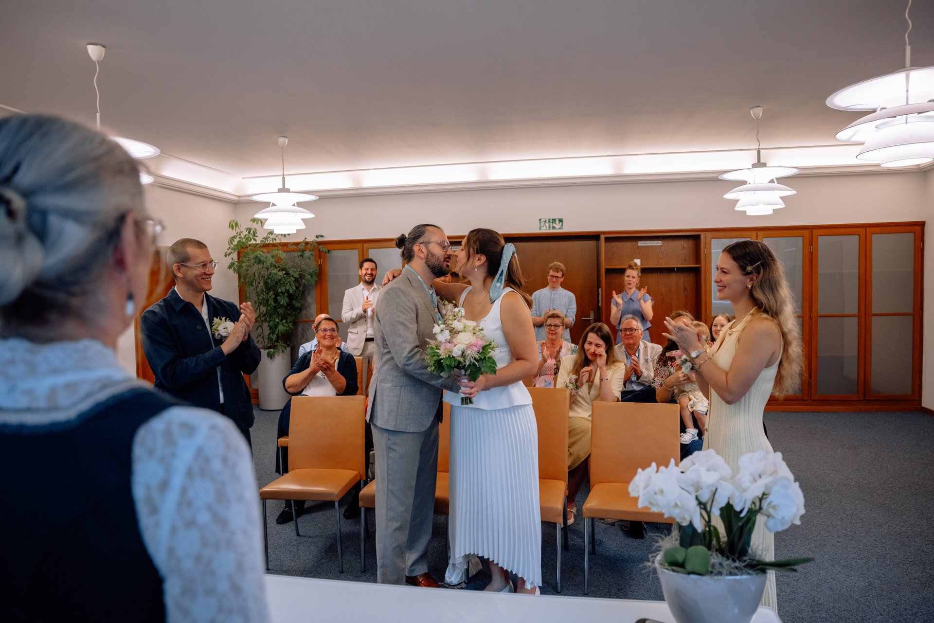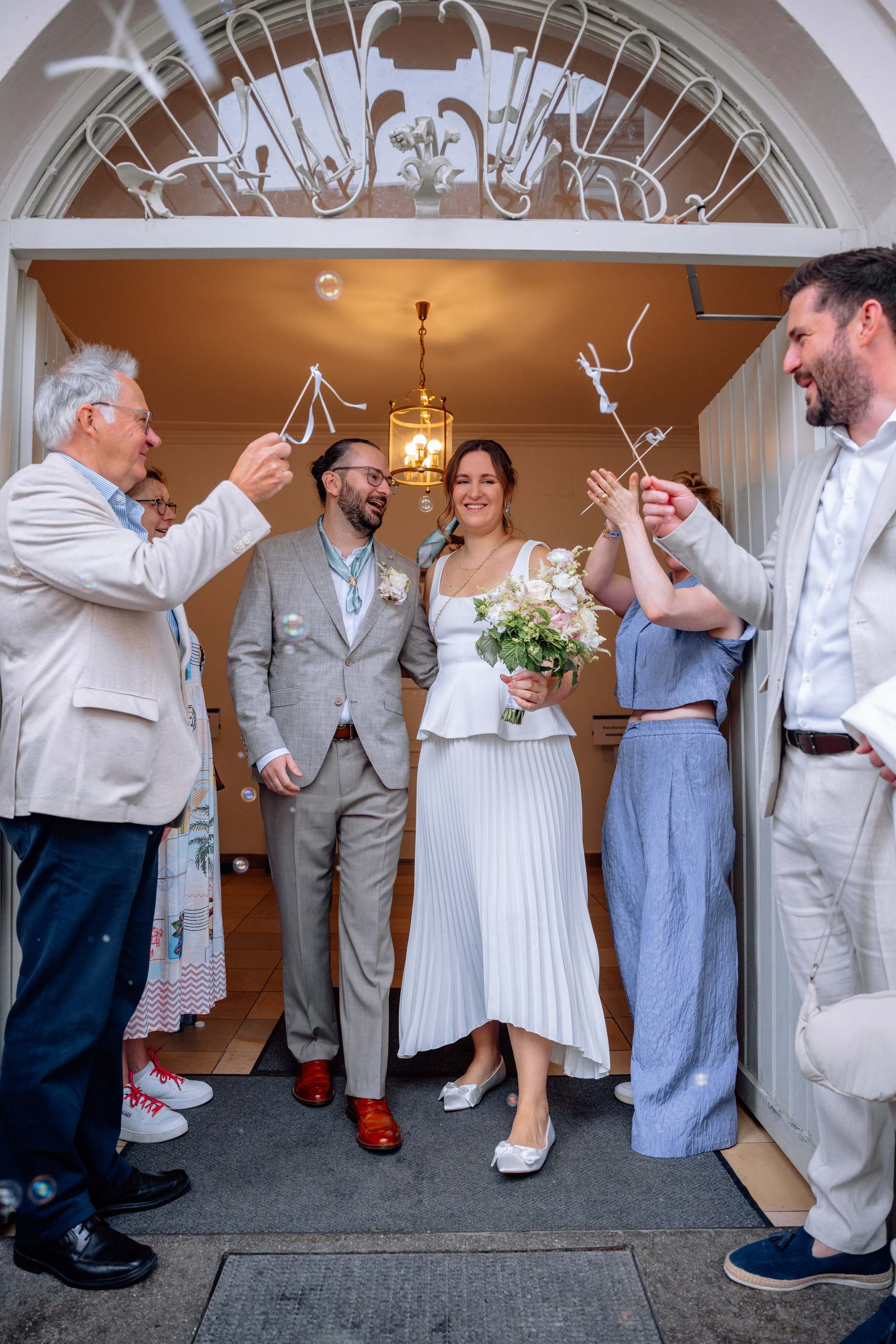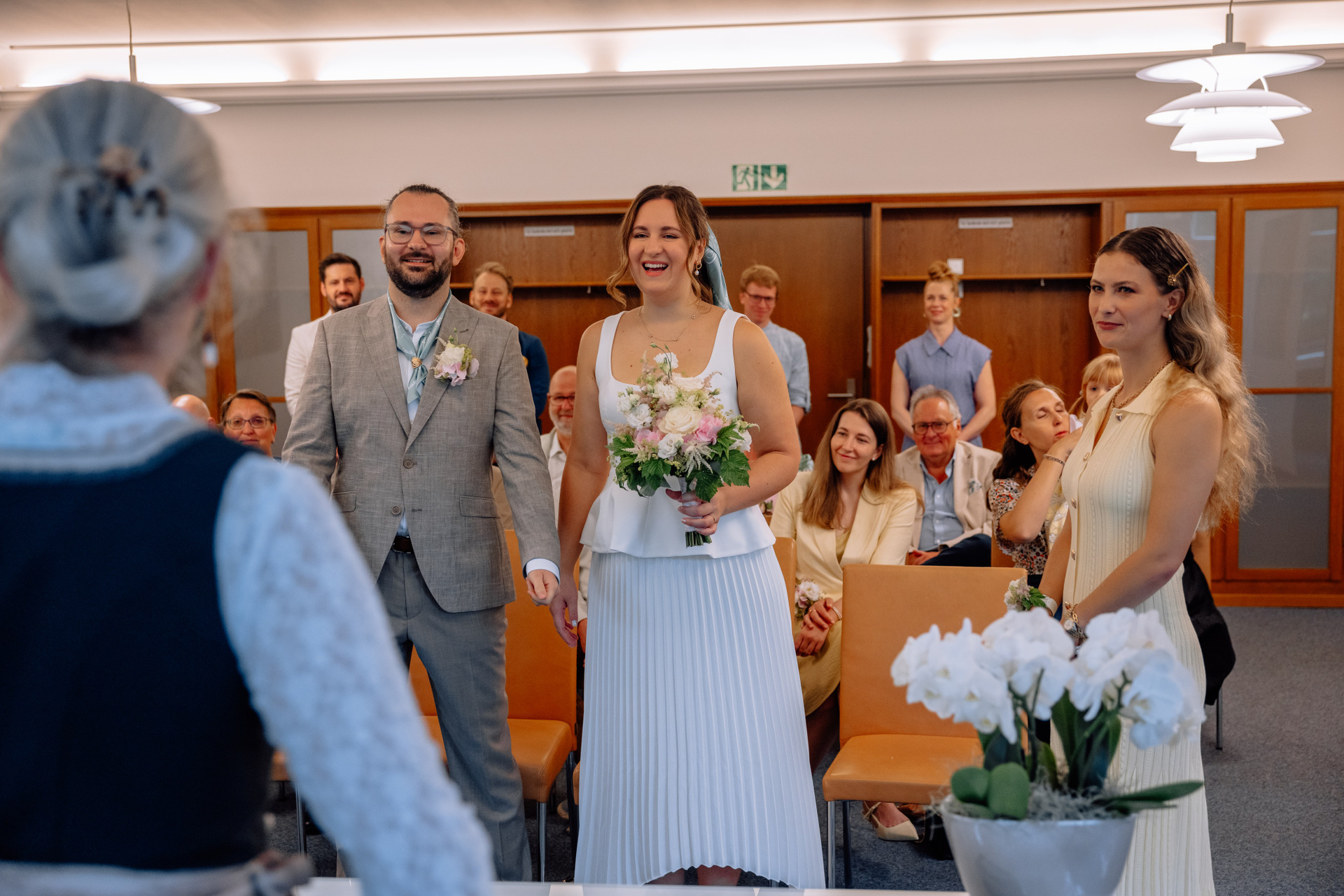 Ein leichter Sommerregen machte diese Trauung im Standesamt Mandlstraße in München noch romantischer. Das junge Brautpaar gab sich in Schwabing das Ja-Wort, bevor wir für Paarfotos in den Englischen Garten gingen. Dort entstanden natürliche Aufnahmen am idyllischen Bachlauf – authentische Hochzeitsbilder, die die besondere Stimmung dieses Tages einfangen.