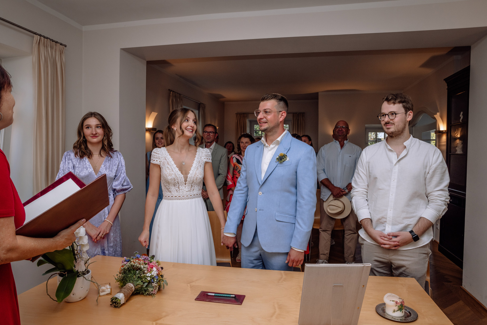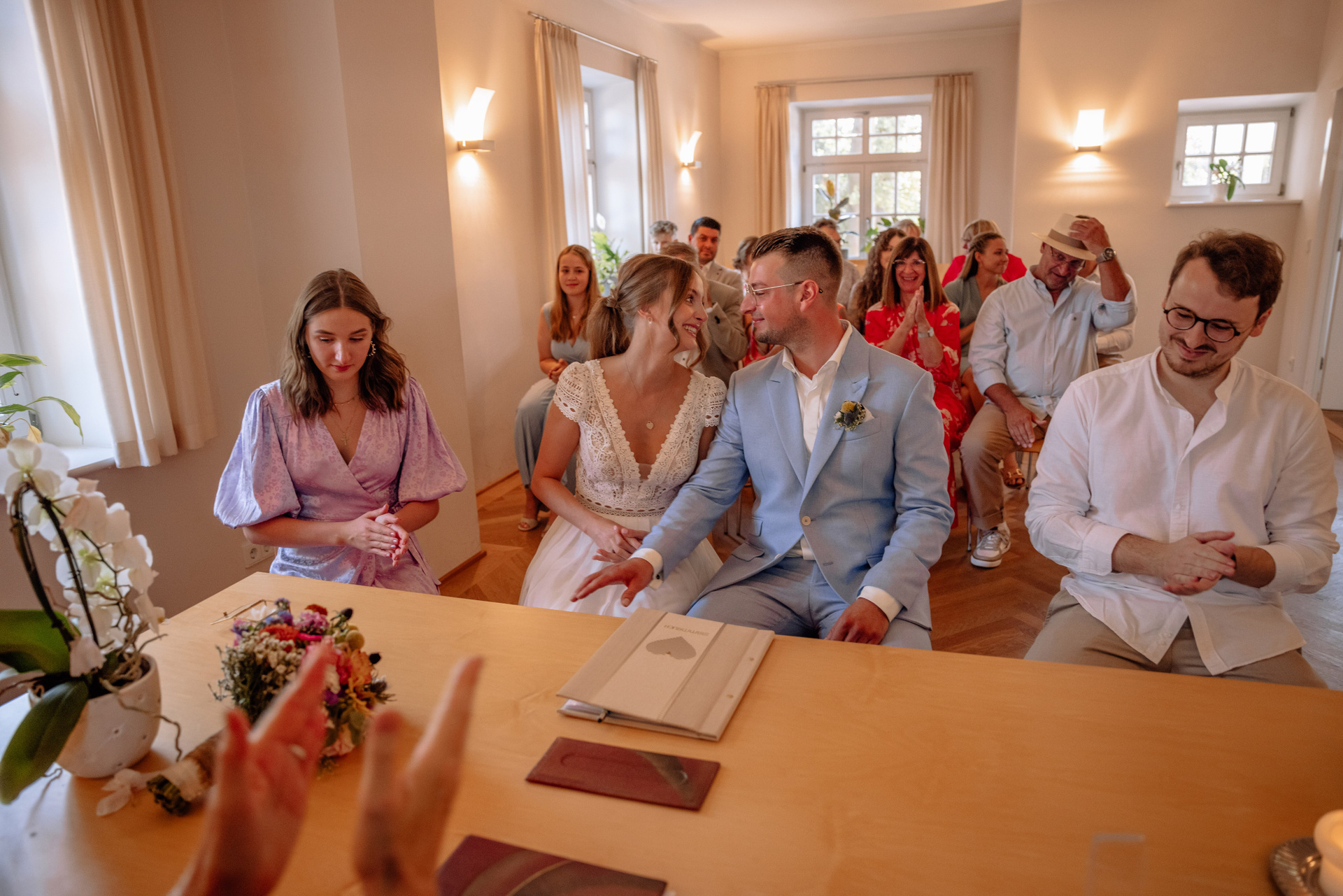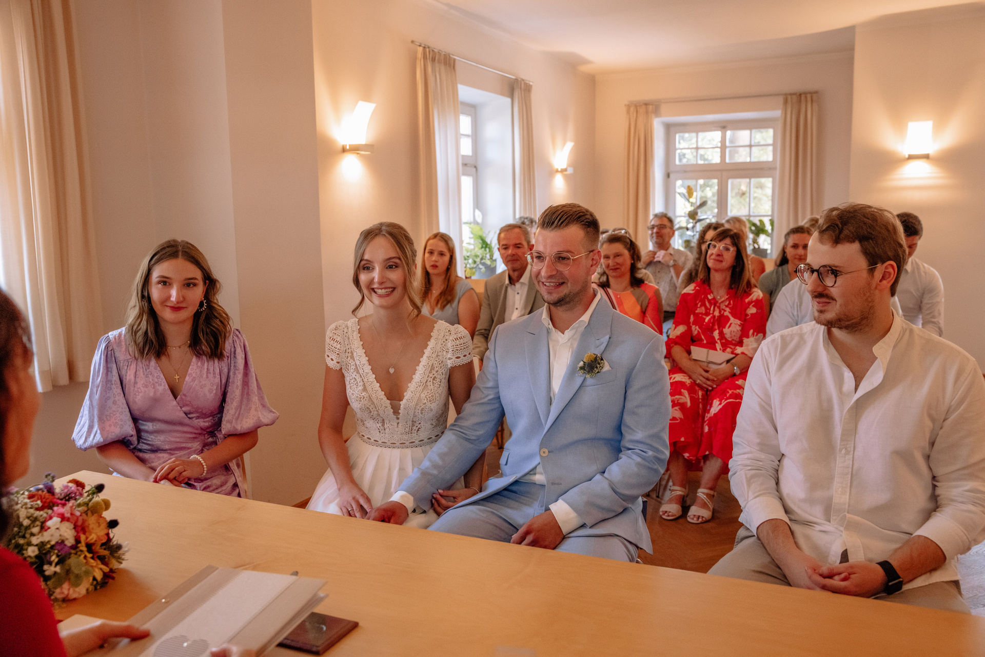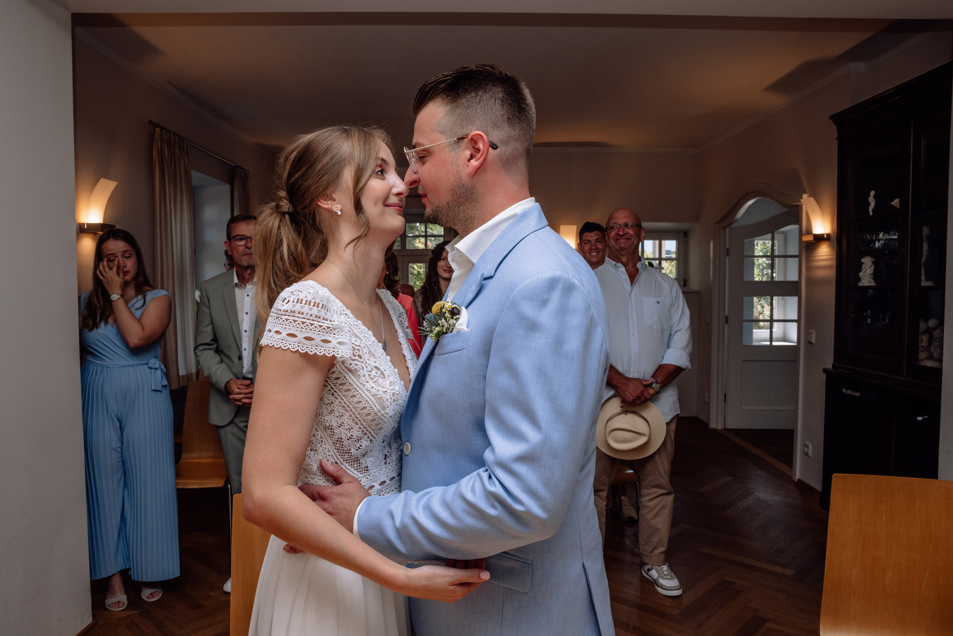 Das kleine Standesamt in Gilching bietet eine sehr persönliche, warme Atmosphäre. An diesem Tag passte alles zusammen: das wunderschöne Licht, die offene Stimmung und die starke emotionale Verbindung zwischen allen Beteiligten.