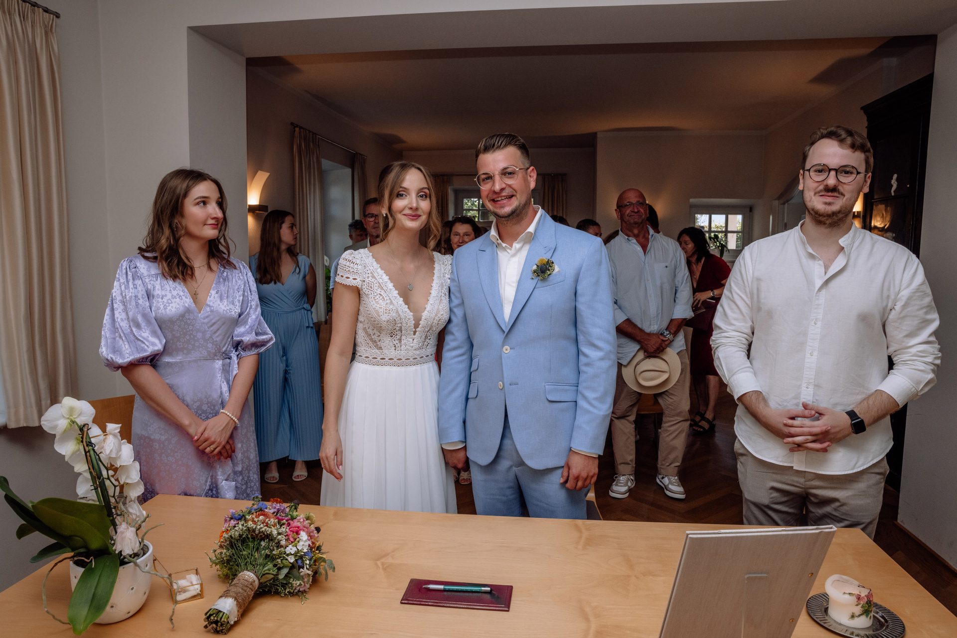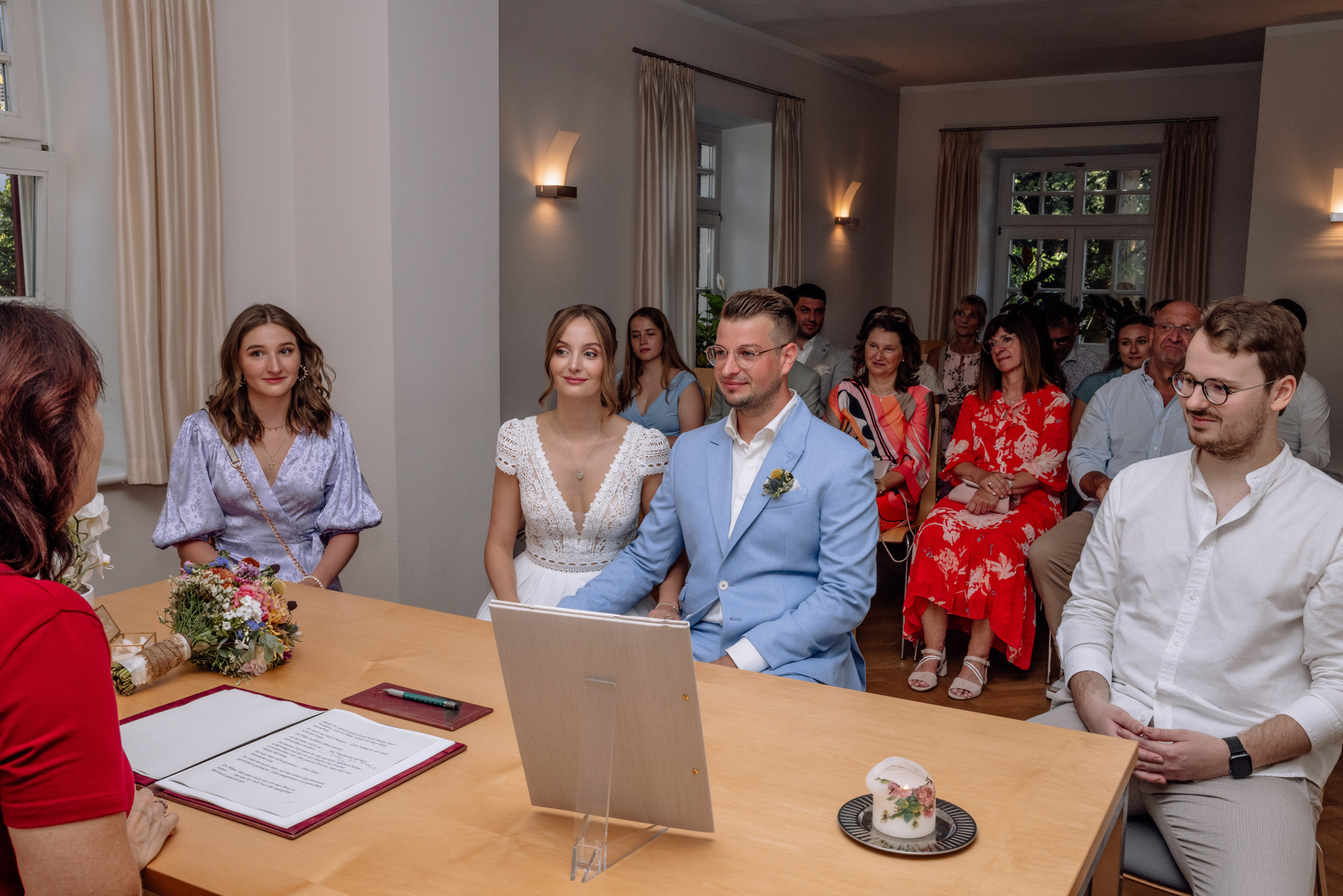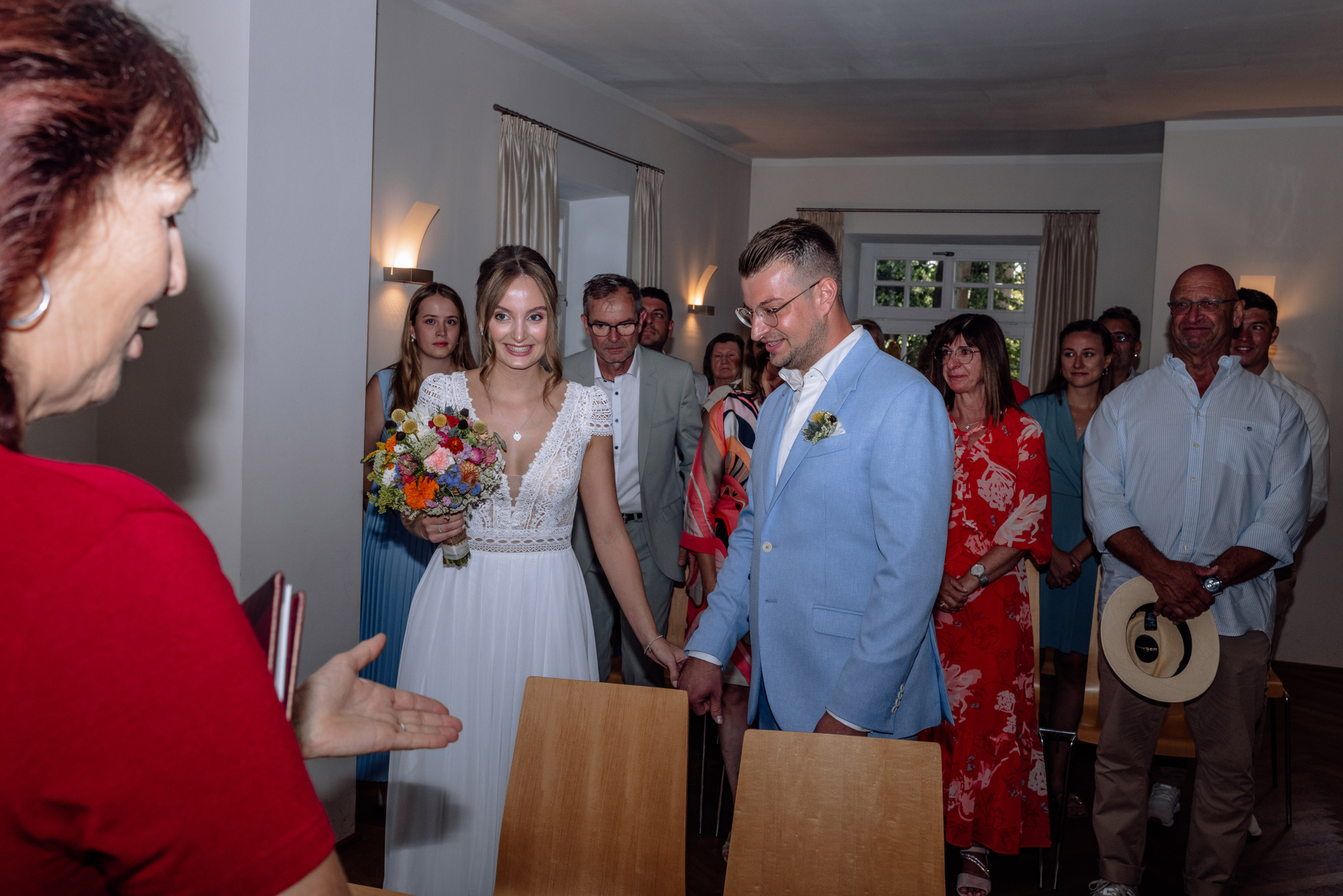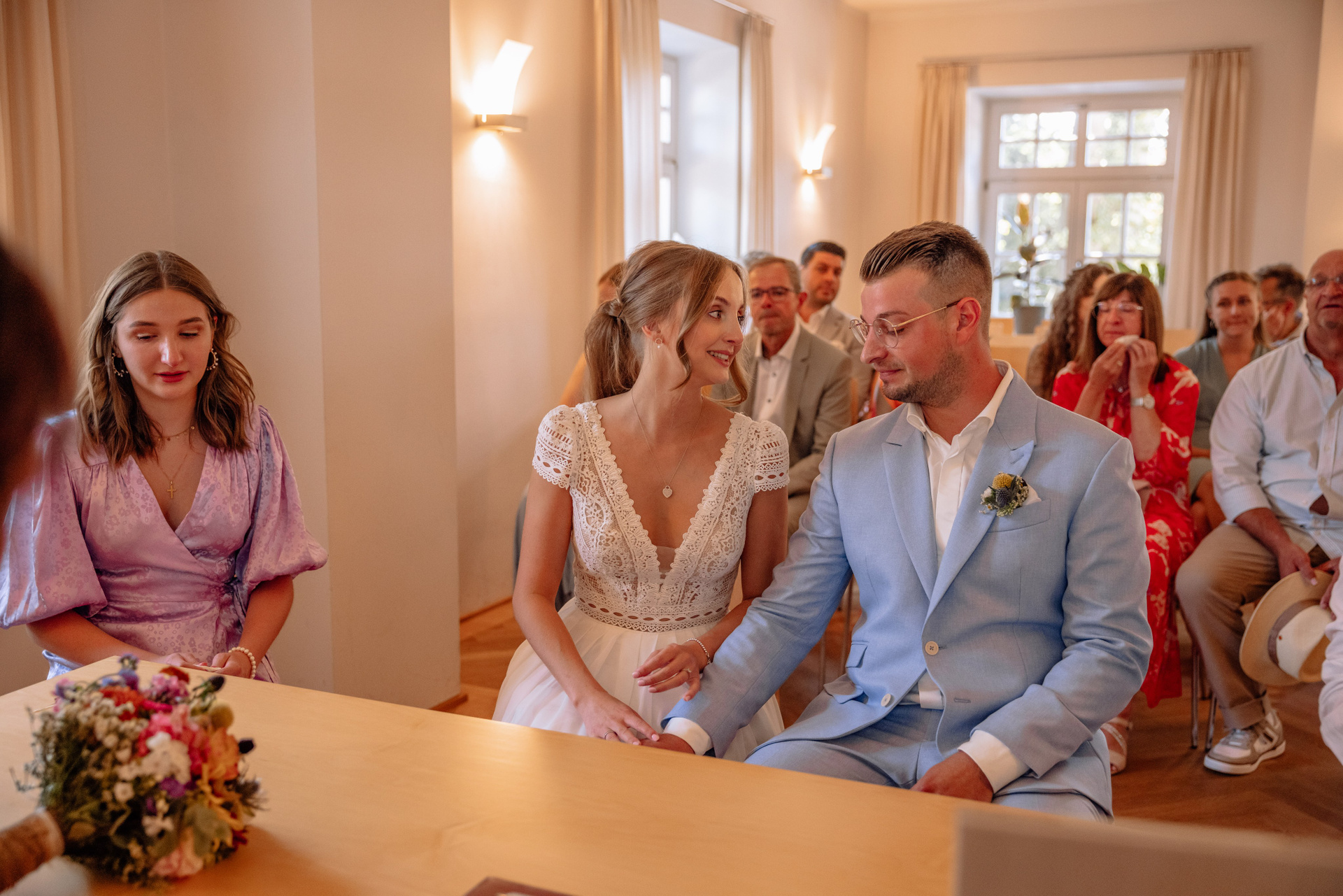 Das kleine Standesamt in Gilching bietet eine sehr persönliche, warme Atmosphäre. An diesem Tag passte alles zusammen: das wunderschöne Licht, die offene Stimmung und die starke emotionale Verbindung zwischen allen Beteiligten.