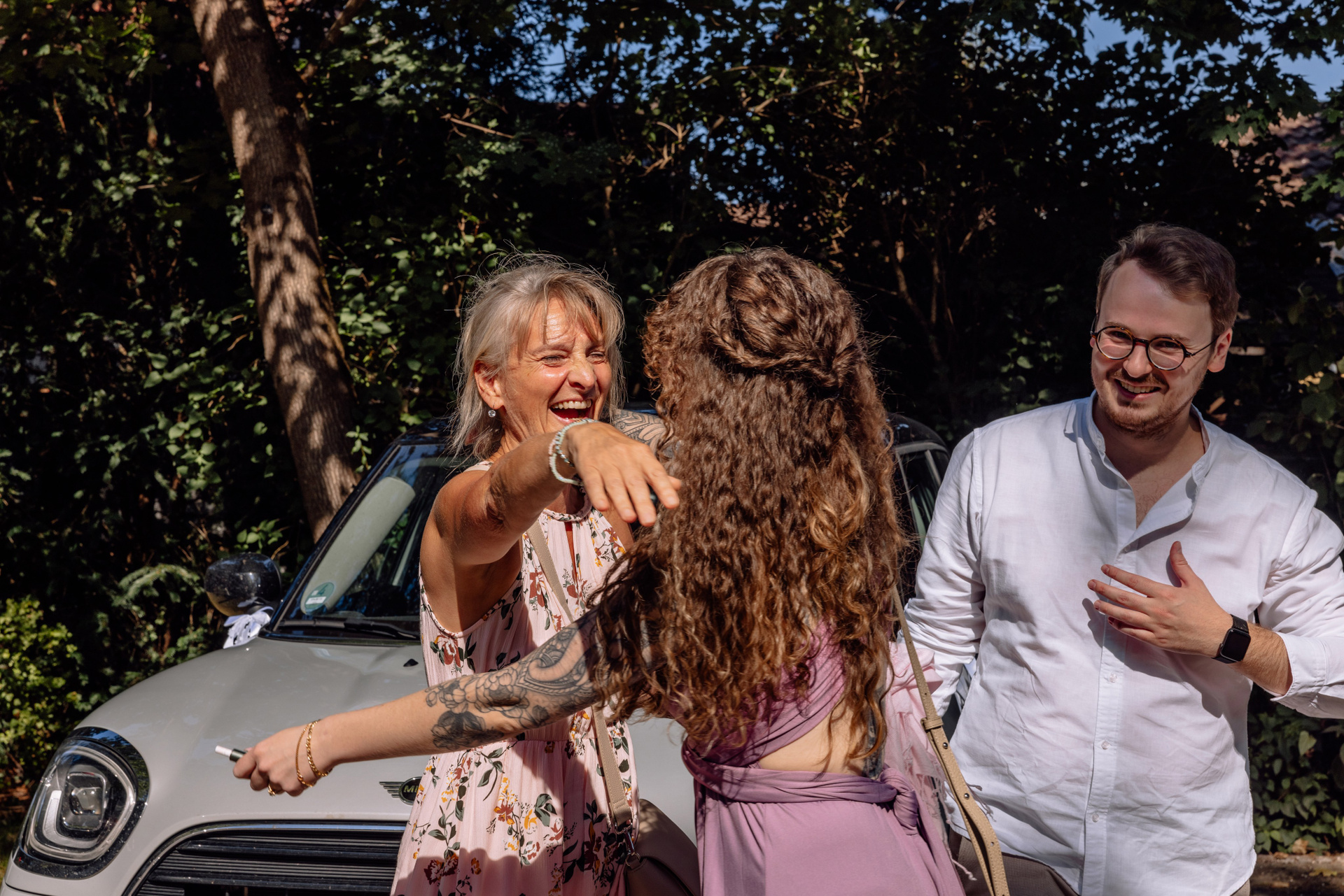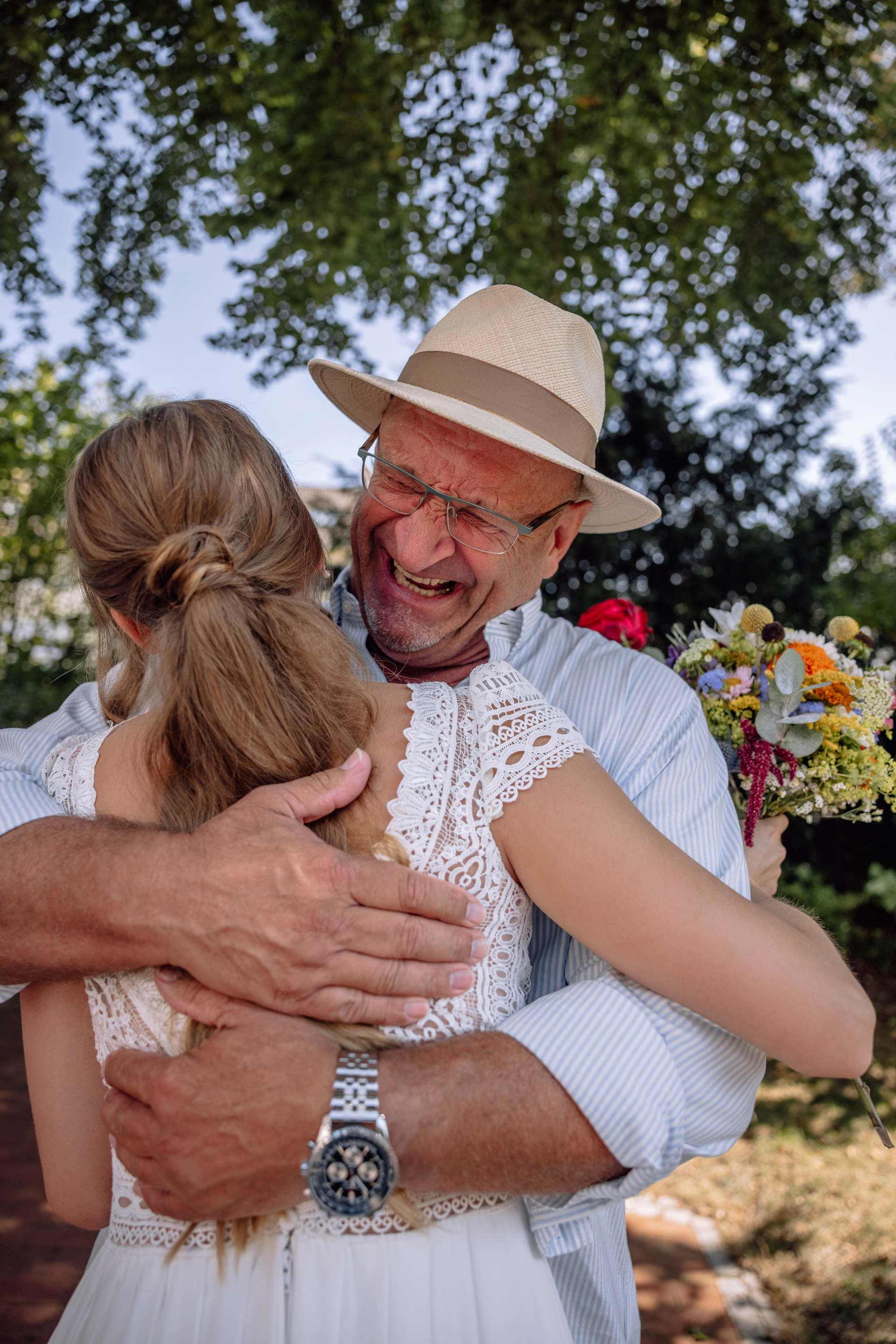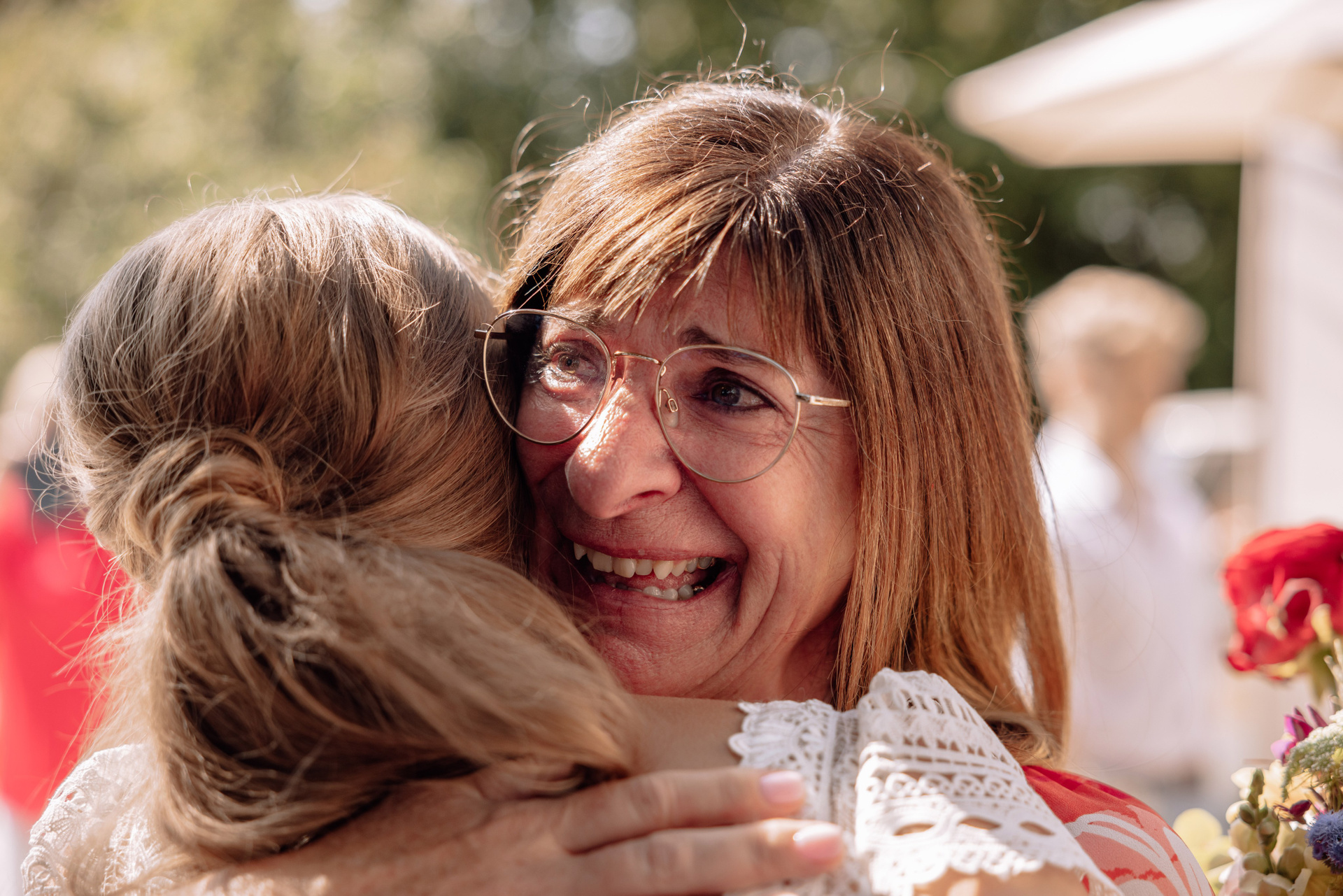 Dabei entstehen oft besonders ehrliche, kleine Augenblicke: Umarmungen, aufgeregtes Lächeln, liebevolle Blicke zwischen Eltern und Kindern. Genau das macht für mich eine authentische Hochzeitsreportage aus.