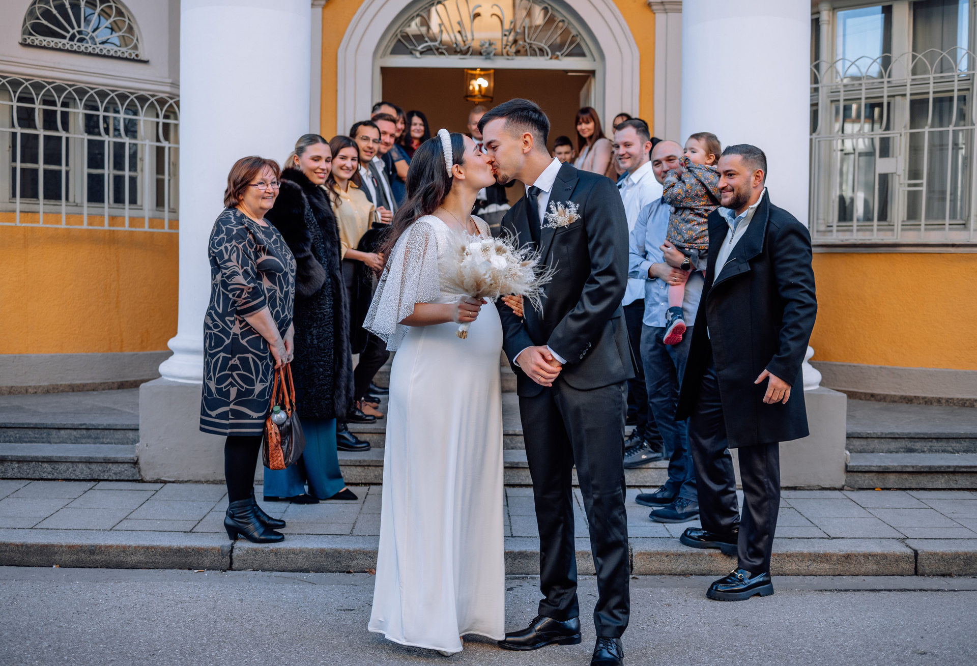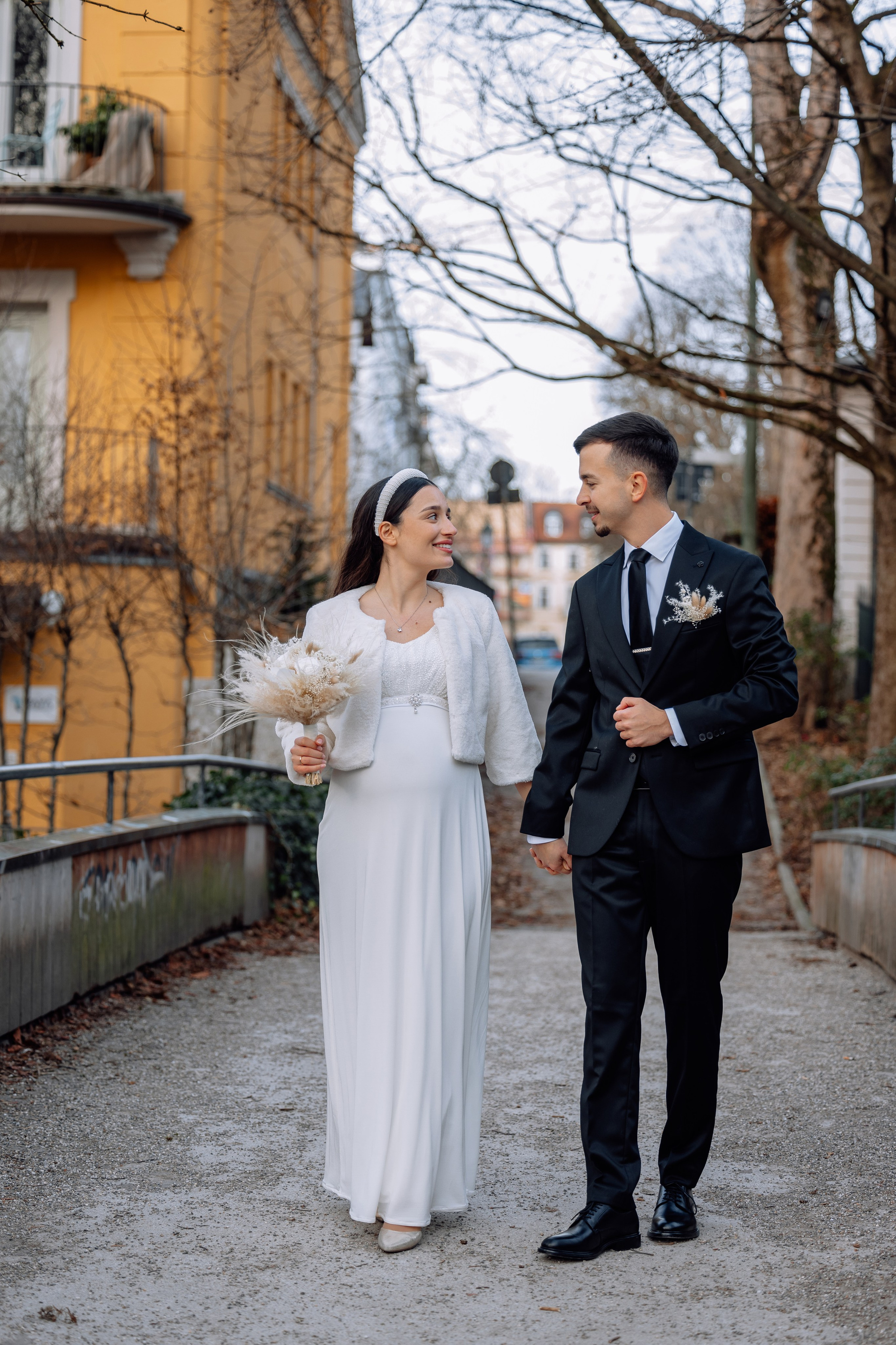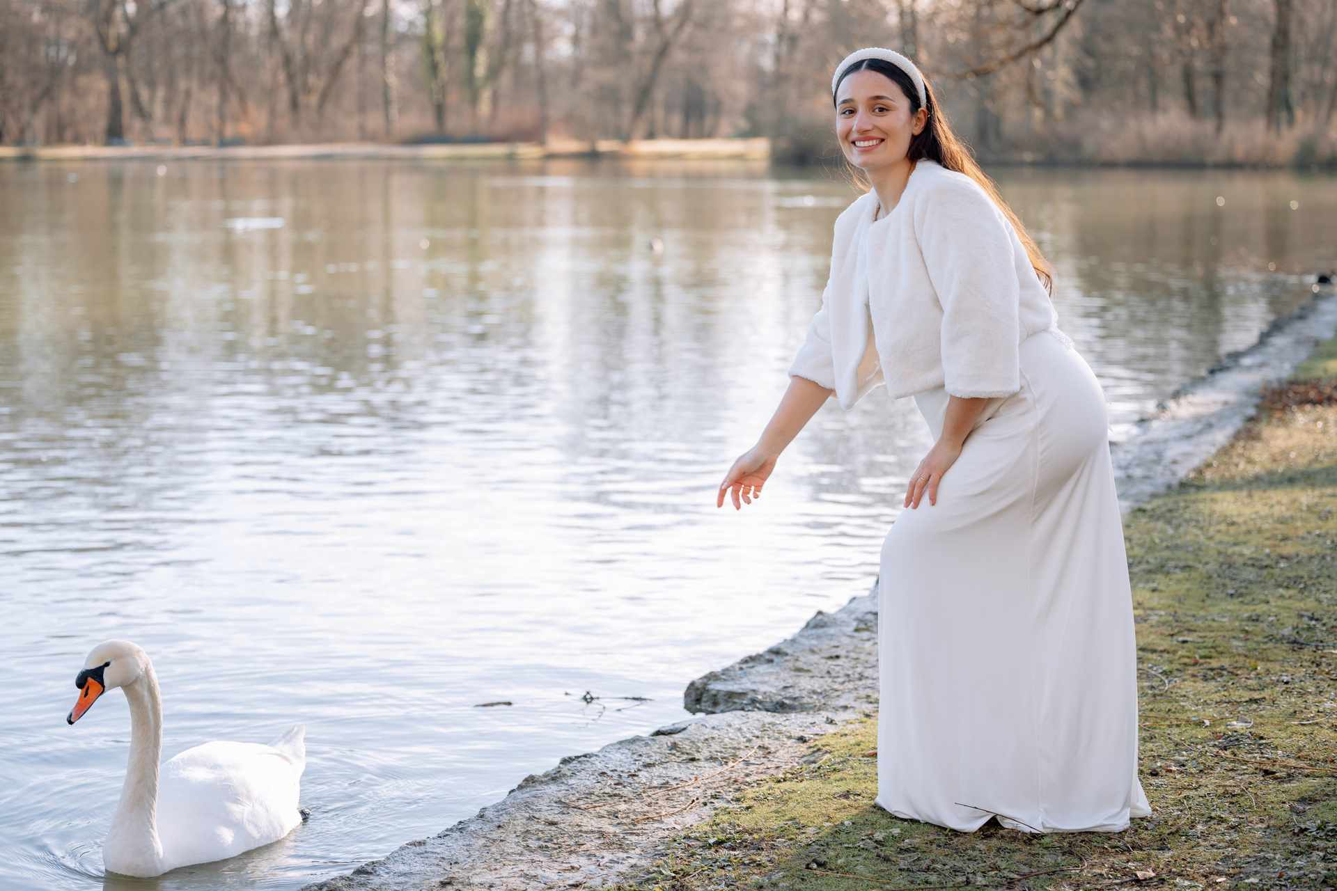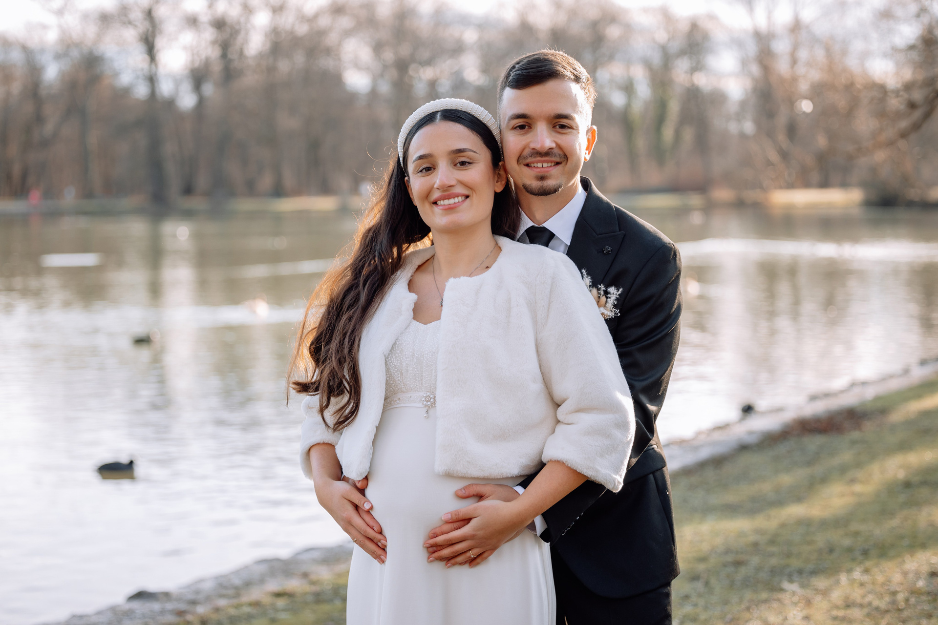 Herbst in Schwabing: Diese Hochzeit im Standesamt Mandlstraße in München war etwas ganz Besonderes. Ein junges Brautpaar, eine wunderschöne schwangere Braut und eine intime Zeremonie in einem der beliebtesten Standesämter Münchens. Nach dem Ja-Wort entstanden romantische Hochzeitsfotos im Englischen Garten – sogar mit eleganten weißen Schwänen, die diesem Tag eine märchenhafte Note verliehen.