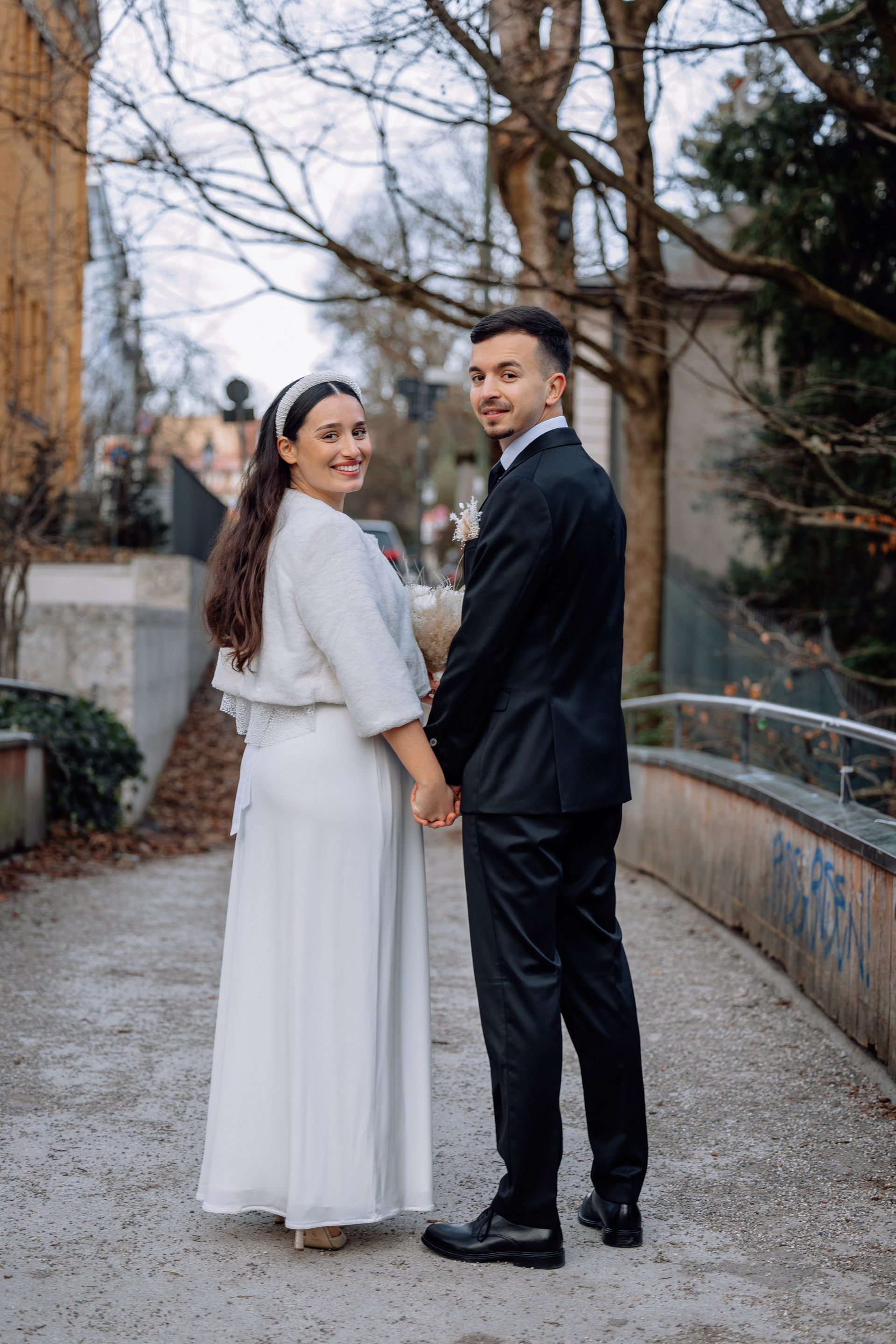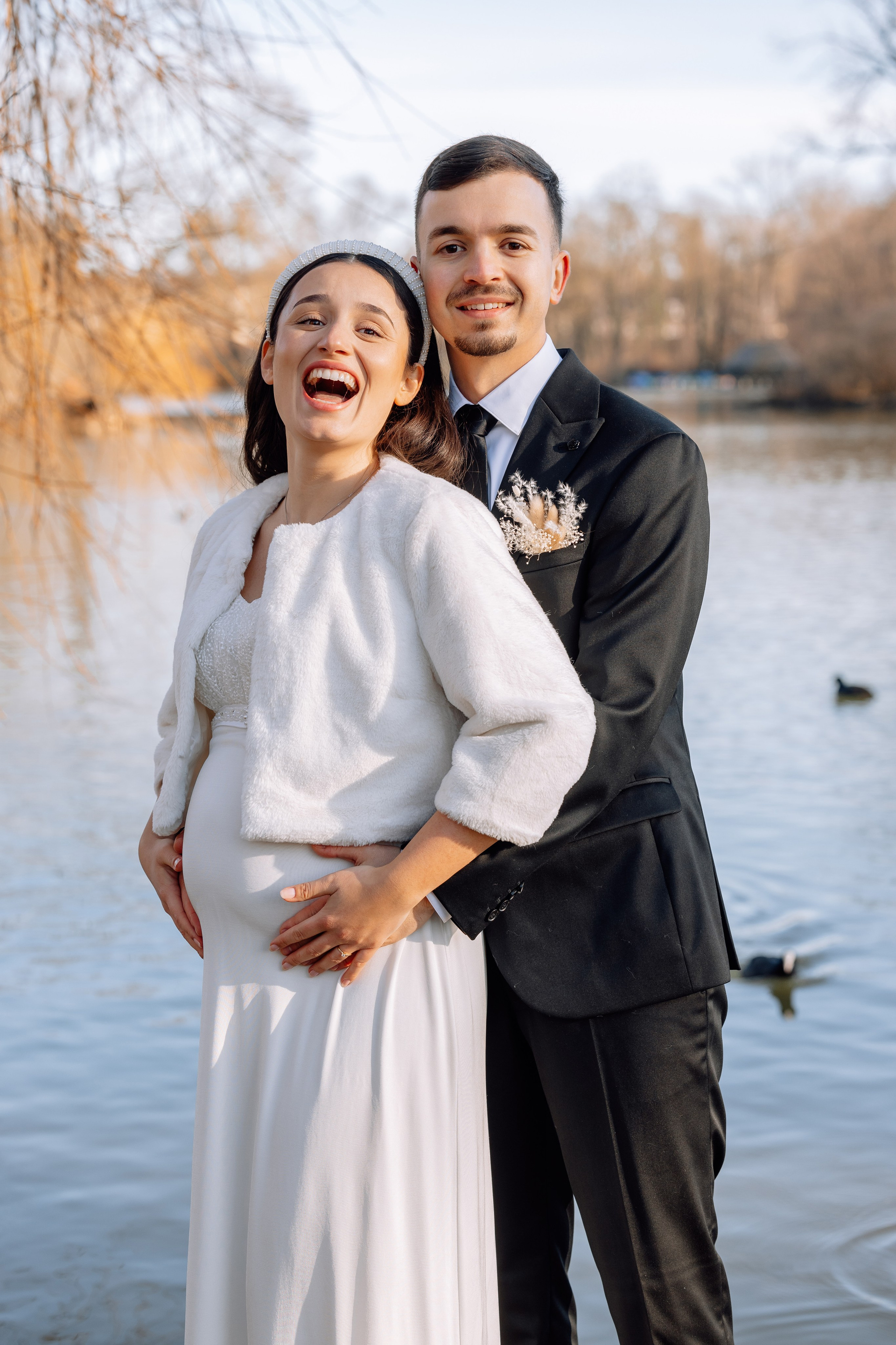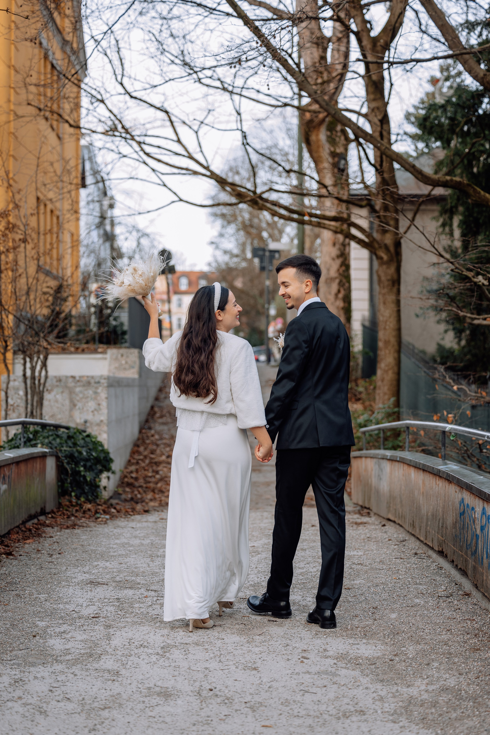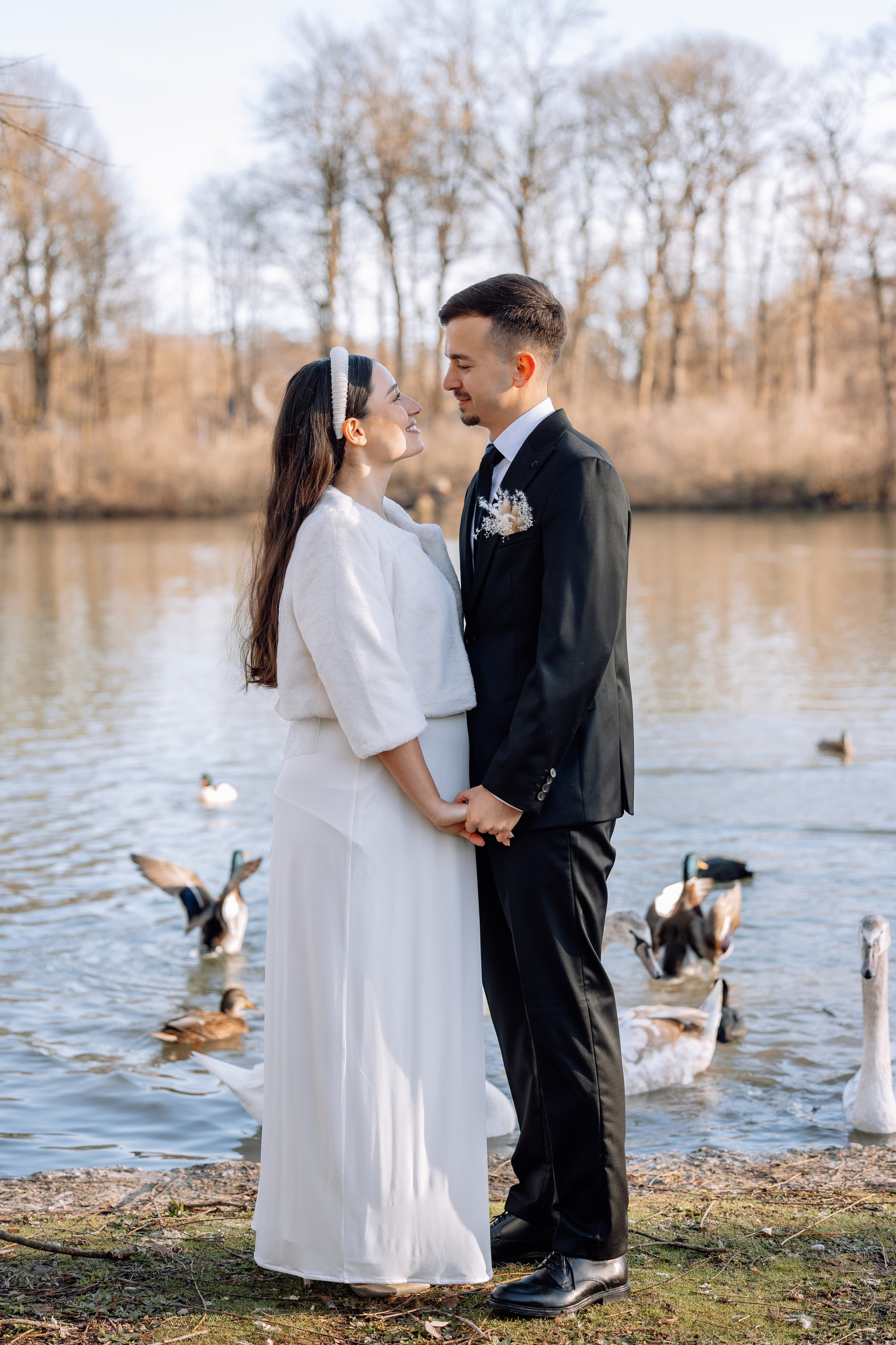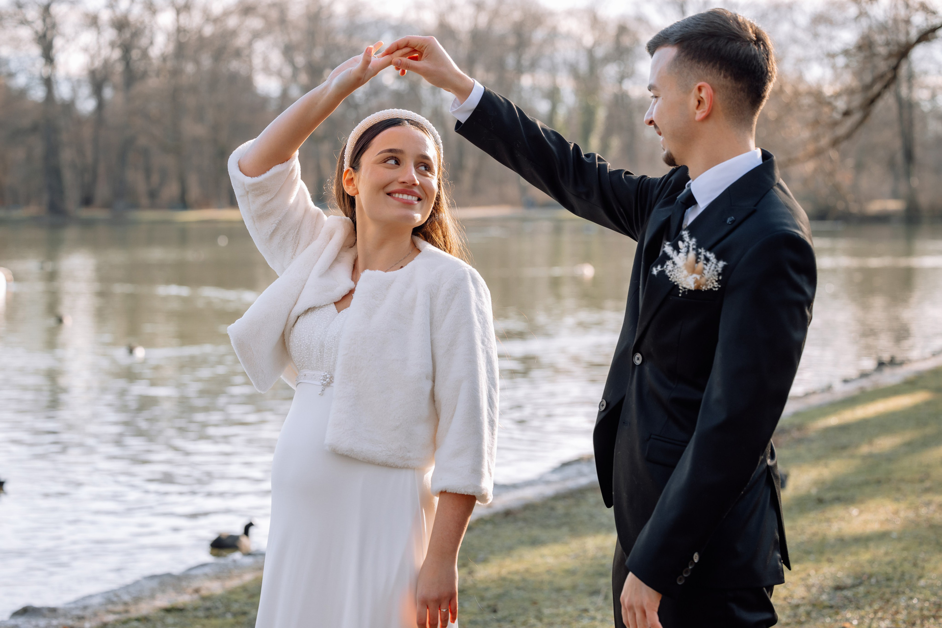 Herbst in Schwabing: Diese Hochzeit im Standesamt Mandlstraße in München war etwas ganz Besonderes. Ein junges Brautpaar, eine wunderschöne schwangere Braut und eine intime Zeremonie in einem der beliebtesten Standesämter Münchens. Nach dem Ja-Wort entstanden romantische Hochzeitsfotos im Englischen Garten – sogar mit eleganten weißen Schwänen, die diesem Tag eine märchenhafte Note verliehen.