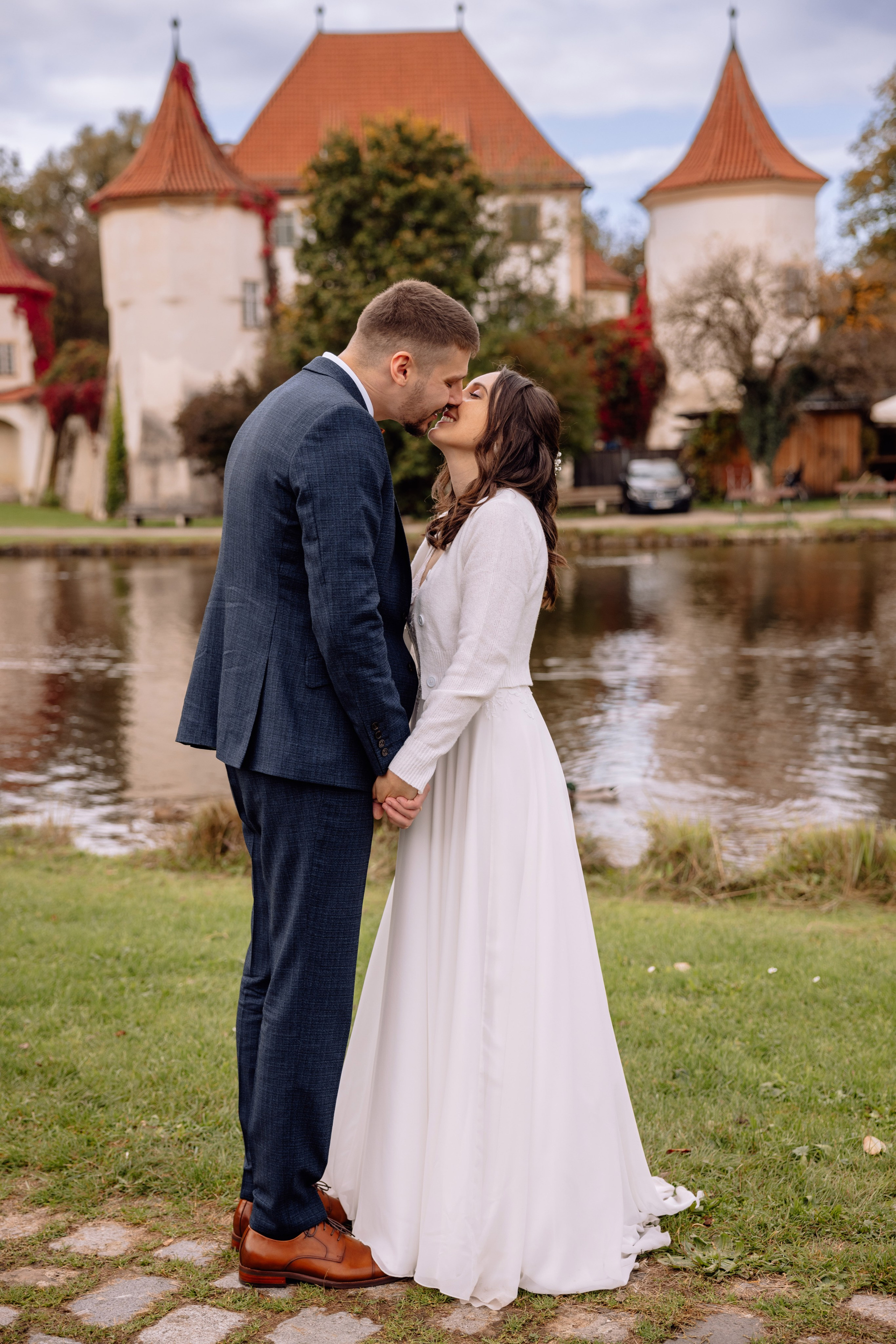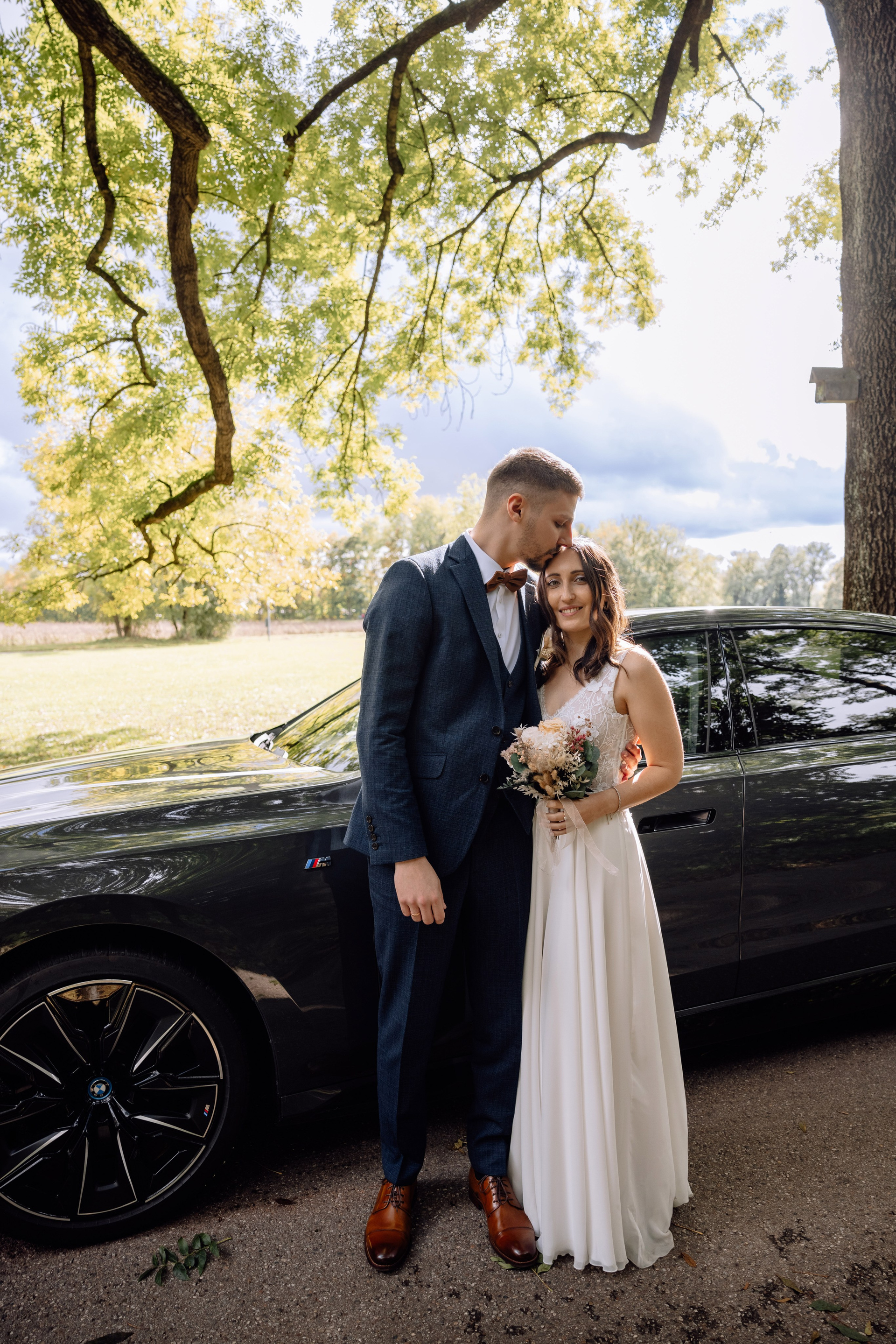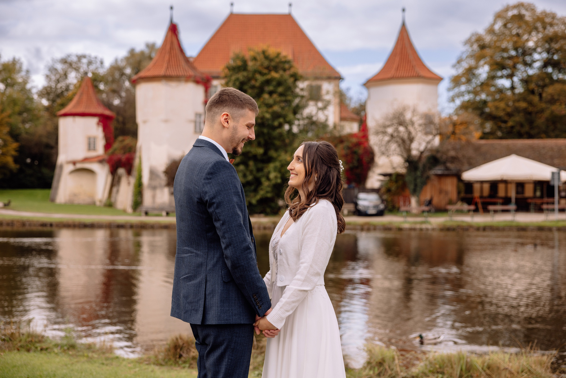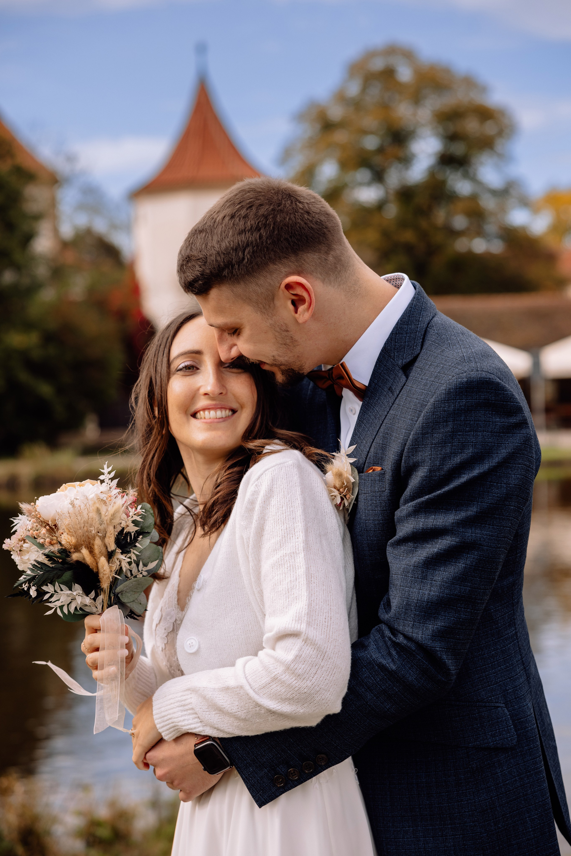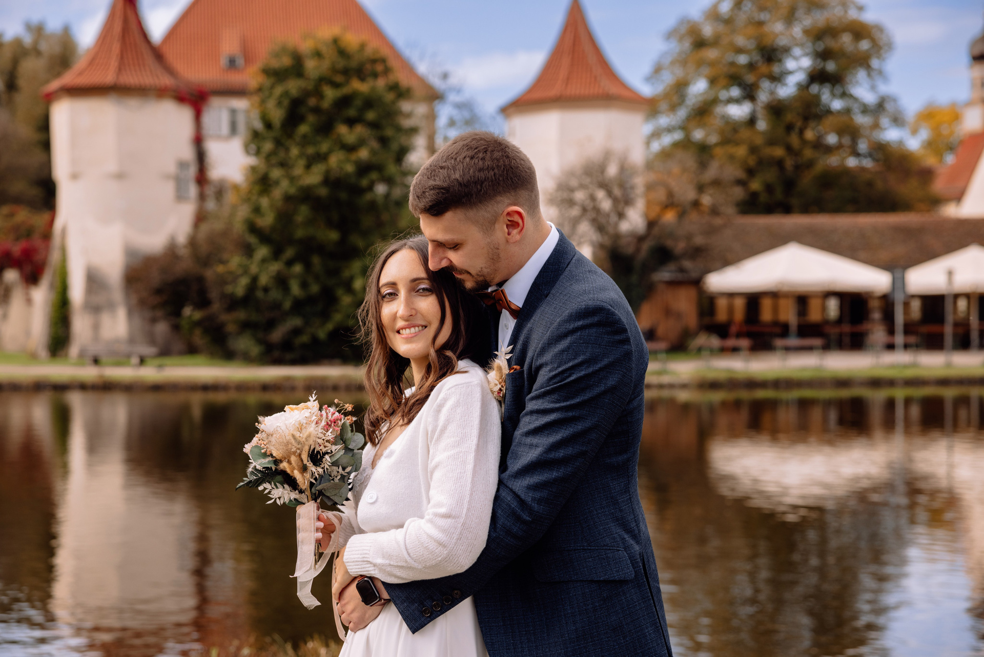 Nach der standesamtlichen Trauung ging es weiter zum Schloss Blutenburg. Dort entstand eine romantische Paarfotografie am See mit dem malerischen Schloss im Hintergrund. Das natürliche Licht war perfekt, weich und stimmungsvoll, sodass jede Aufnahme die besondere Verbindung und die Schönheit dieses Tages einfing.