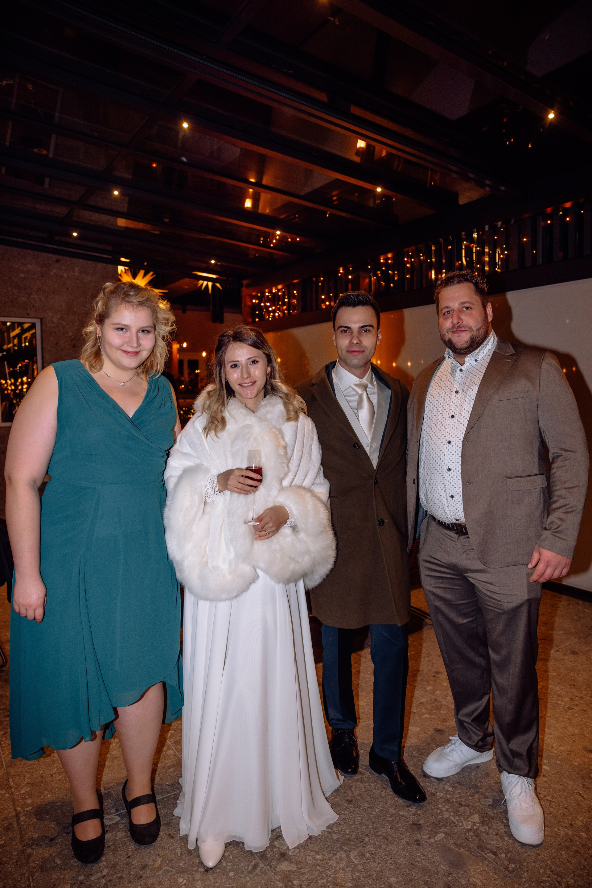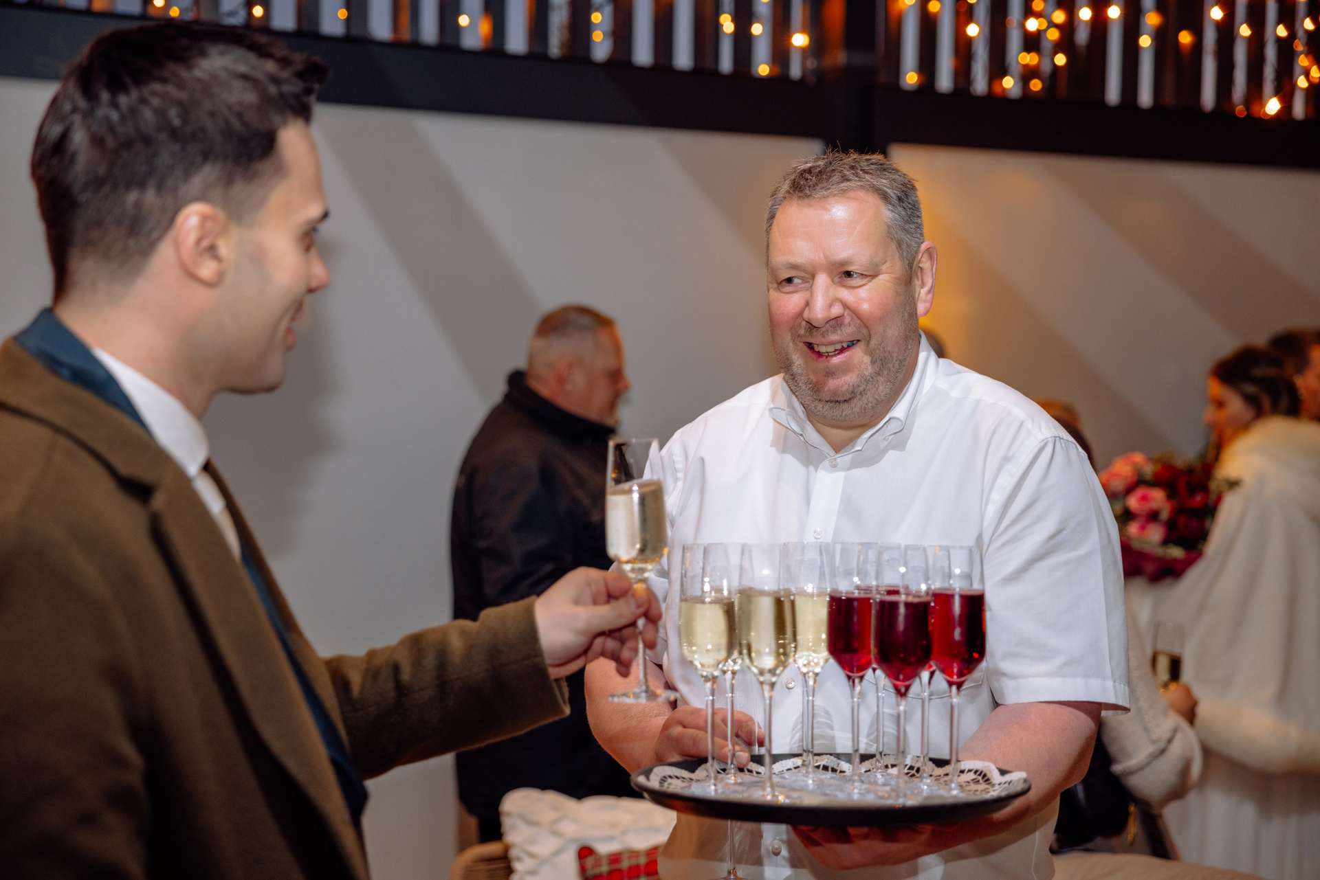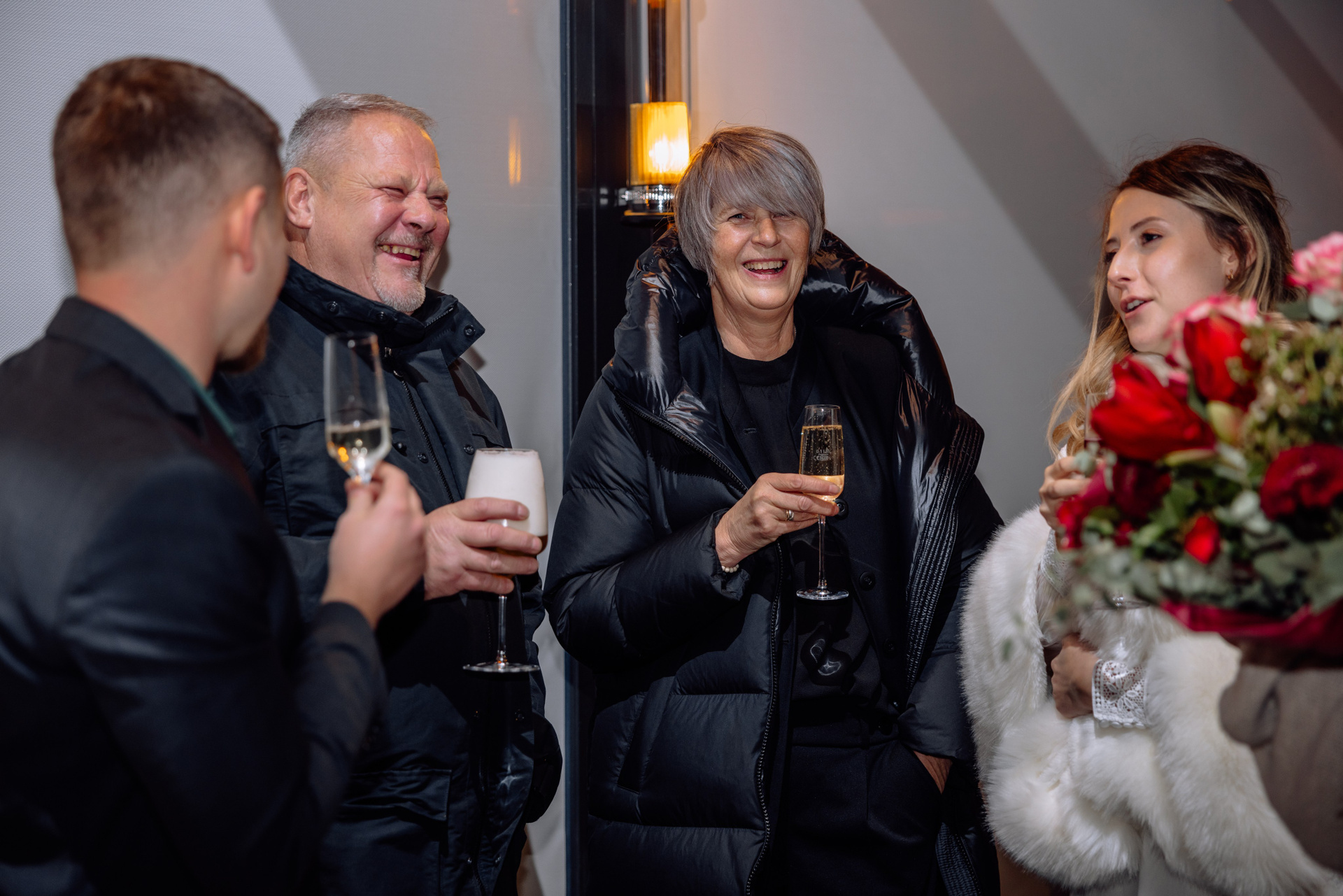In einem liebevoll gestalteten Raum kamen Familie und Freunde zusammen, um auf das Brautpaar anzustoßen.