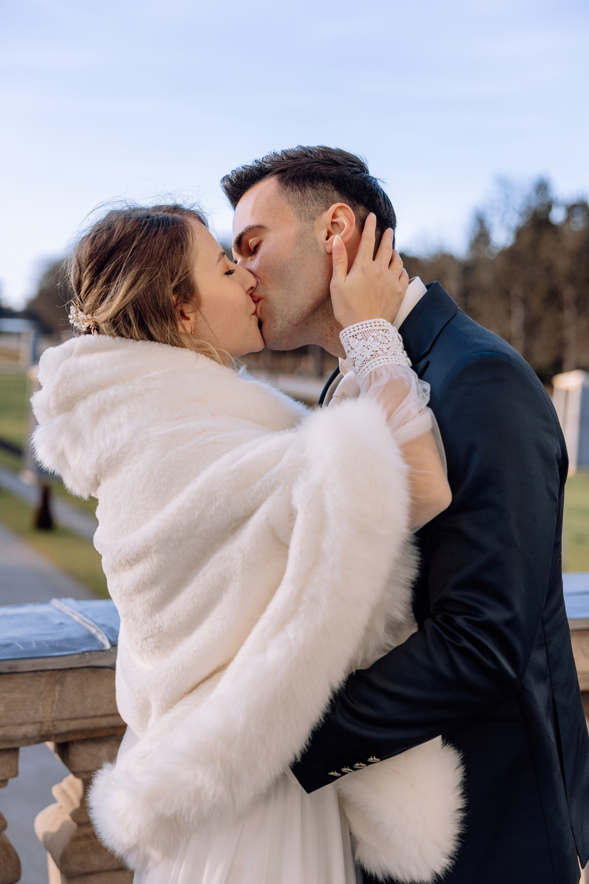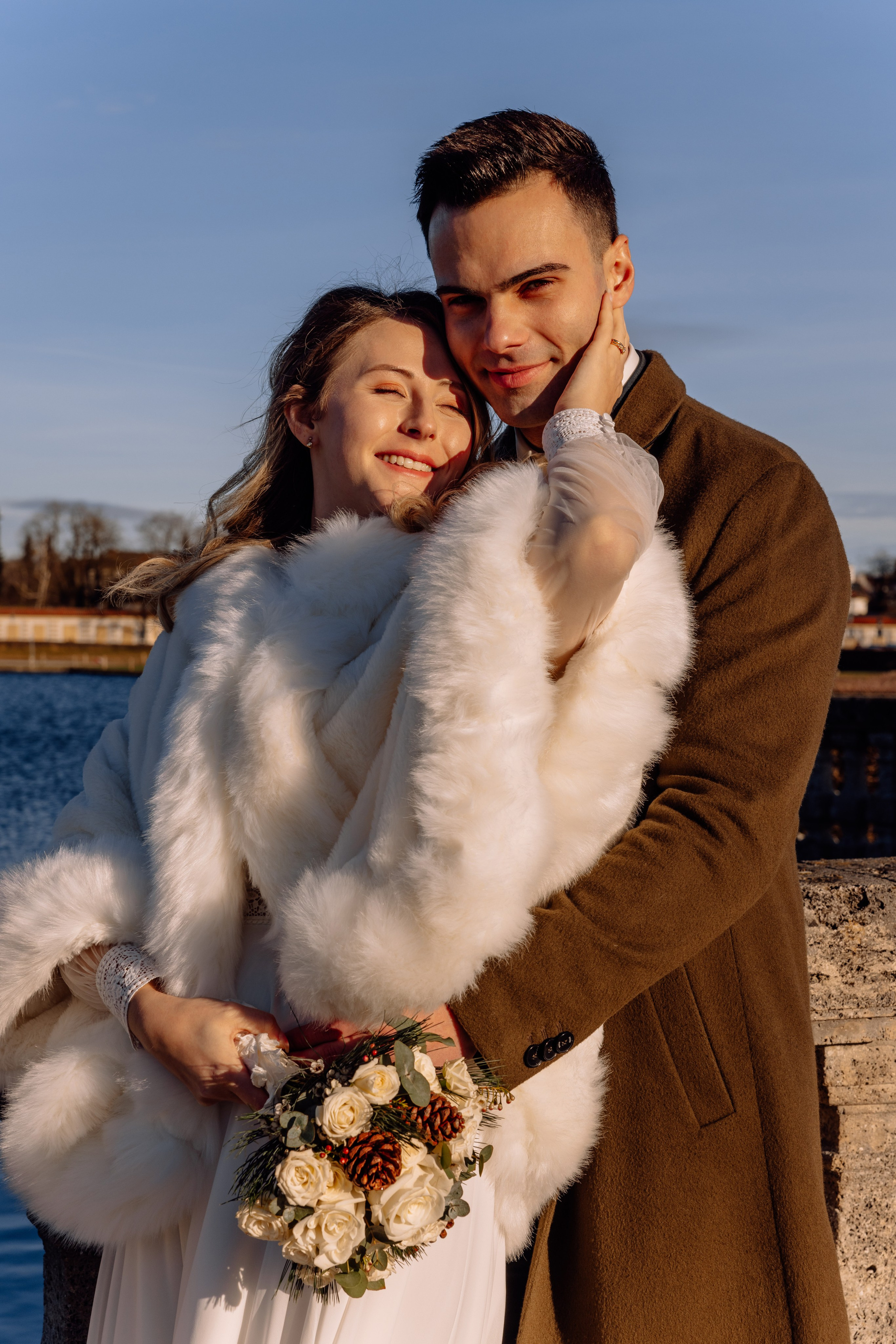 Die elegante Architektur, das weiche Licht am Nachmittag, die Spiegelung im Wasser und das ruhige Grün im Park bildeten eine traumhafte Kulisse für Paarportraits voller Intimität und Anmut.